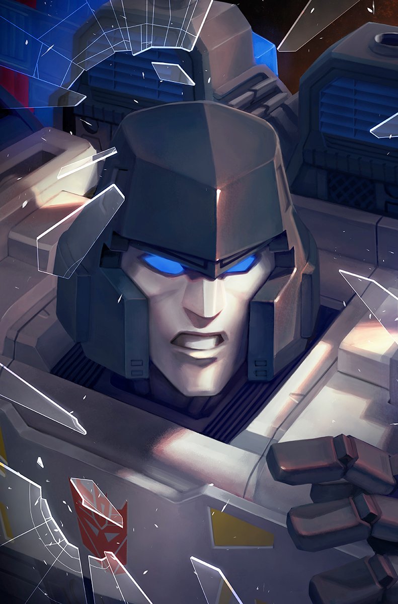 1boy blue_eyes broken_glass comic_cover commentary cover cover_page decepticon english_commentary glass highres mecha megatron megatron_(shattered_glass) no_humans official_art open_hand parted_lips robot sara_p-d science_fiction solo textless_version transformers transformers:_shattered_glass upper_body
