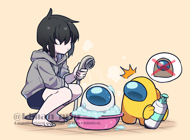 3others ^^^ ambiguous_gender among_us black_hair commentary crewmate_(among_us) grey_hoodie hood hood_down hoodie kiman multiple_others short_hair shower_head soap_bottle soap_bubbles squatting steam they_(kiman) tile_floor tiles twitter_username washbowl washing water watermark white_(among_us) yellow_(among_us)