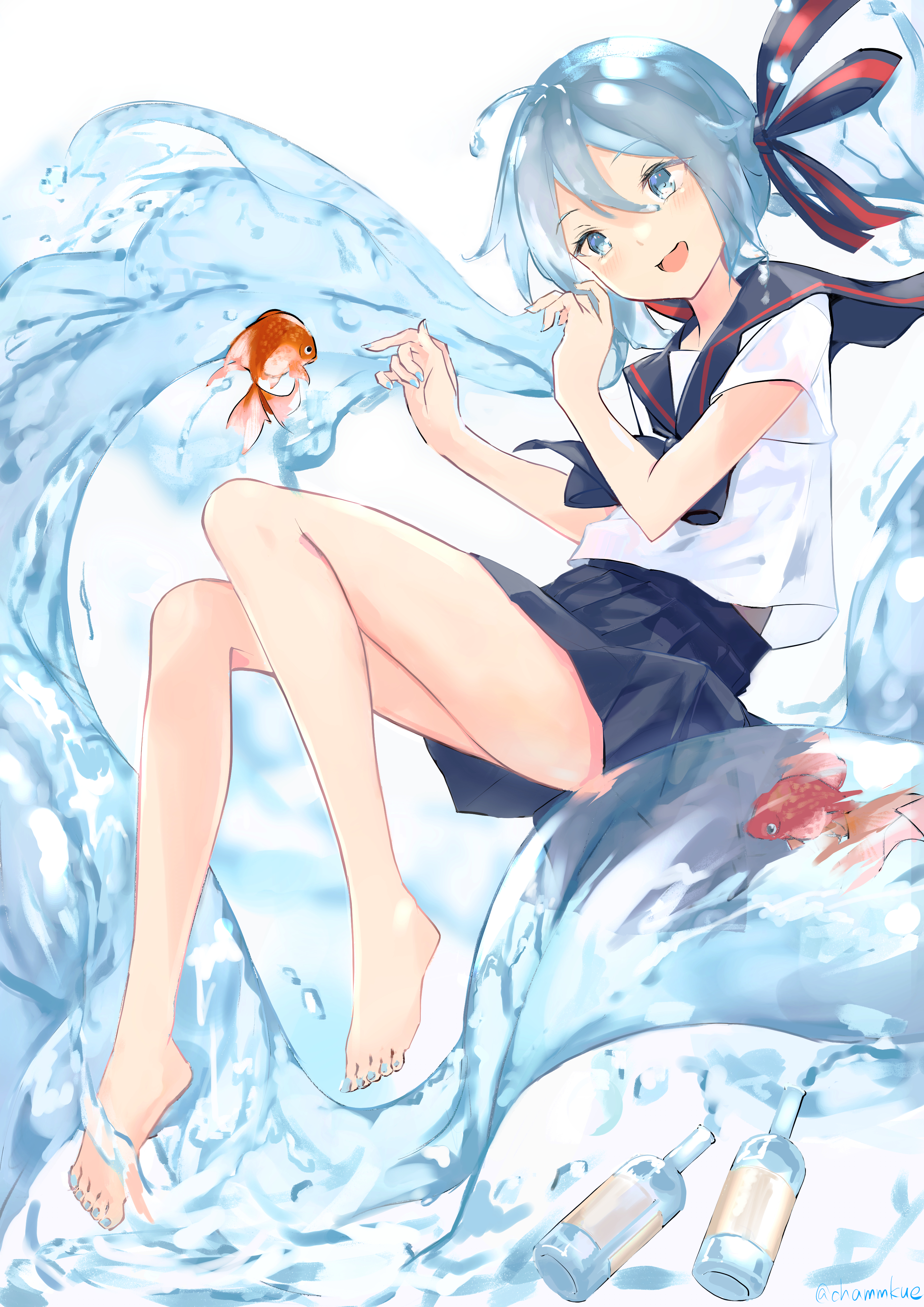 1girl absurdly_long_hair absurdres aqua_nails bad_id bad_pixiv_id barefoot black_collar black_neckwear black_skirt blue_eyes blue_hair bottle bottle_miku chamu_(chammkue) collar commentary fish full_body goldfish hair_ribbon hatsune_miku highres light_blue_hair liquid_hair long_hair miniskirt nail_polish open_mouth pleated_skirt ribbon sailor_collar school_uniform serafuku shirt short_sleeves skirt smile solo striped_ribbon toenail_polish toenails twintails very_long_hair vocaloid white_shirt