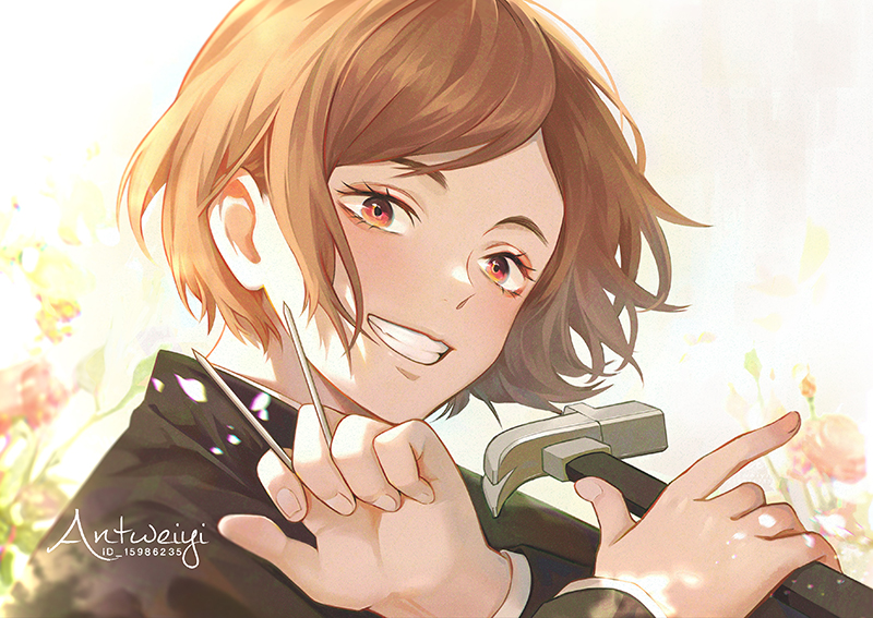 1girl antweiyi black_jacket brown_eyes brown_hair flower hammer hands_up holding holding_weapon jacket jujutsu_kaisen kugisaki_nobara nail_(hardware) petals rose rose_petals school_uniform short_hair smile solo teeth weapon