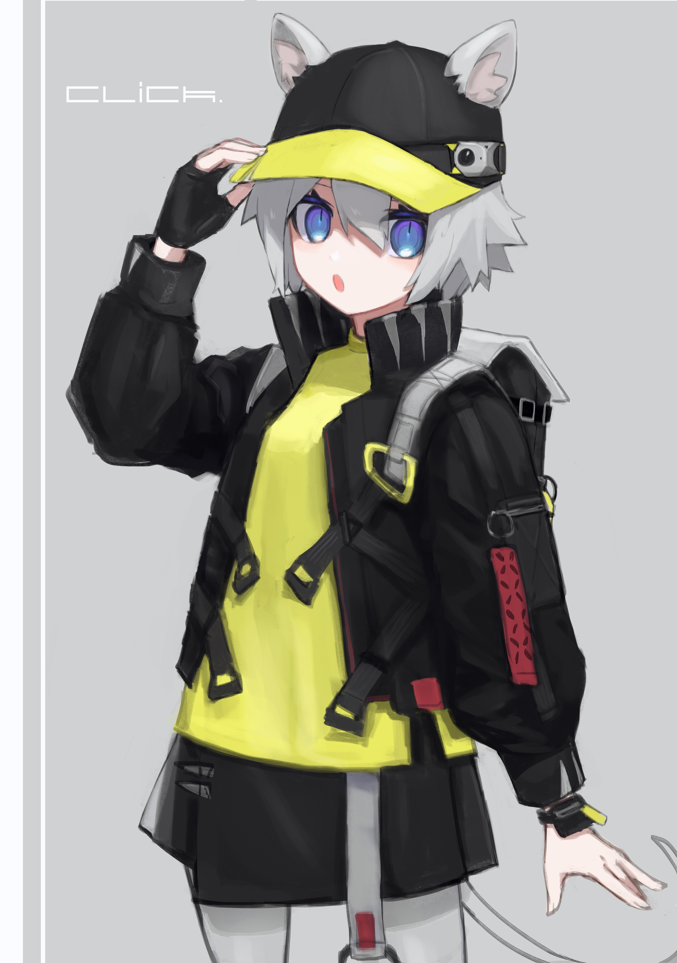 1girl 3rd_rb absurdres adjusting_clothes adjusting_headwear animal_ears arknights backpack bag baseball_cap black_gloves black_hat black_jacket black_skirt blue_eyes character_name click_(arknights) commentary fingerless_gloves gloves green_hair grey_background grey_hair hair_between_eyes hat highres jacket long_sleeves mouse_ears mouse_tail open_clothes open_jacket open_mouth shirt short_hair single_glove skirt solo tail two-tone_headwear yellow_hat