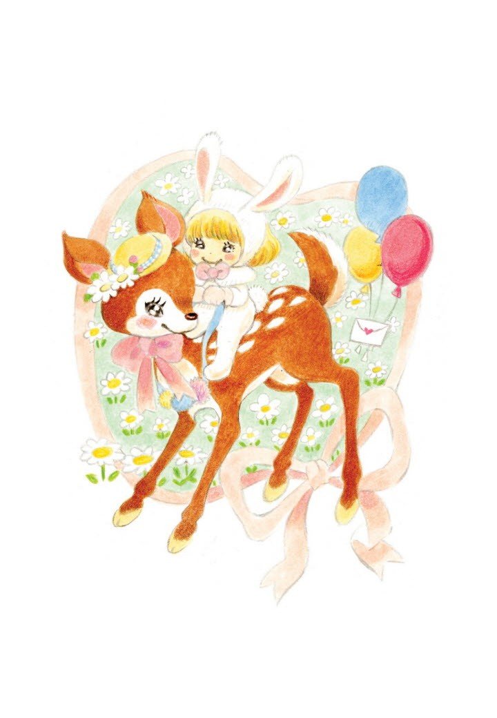 1girl animal animal_costume animal_ears balloon black_eyes blonde_hair blunt_bangs blush_stickers bob_cut bow bowtie bud child closed_mouth colorful daisy_(flower) deer dot_nose eyelashes fake_animal_ears field floral_background flower flower_field full_body hat hat_flower heart heart_background holding holding_reins kawamoto_momo leaf letter love_letter neck_ribbon pale_color pastel_colors pink_bow pink_ribbon plaid_clothes plaid_headwear pom_pom_(clothes) rabbit_costume rabbit_ears rabbit_tail reins ribbon riding sangatsu_no_lion short_hair simple_background smile solo sun_hat tail umino_chika white_background white_flower