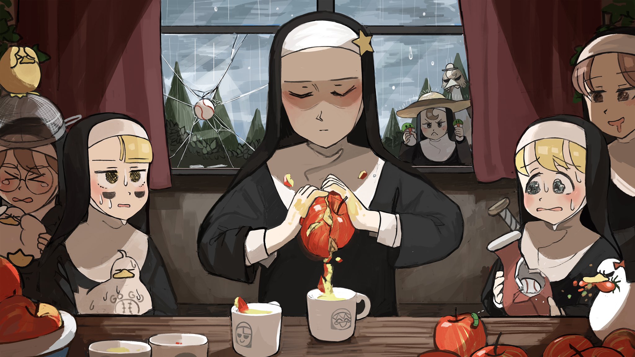 >_< 6+girls animal animal_on_head apple apple_juice baby_animal baseball baseball_bat bird bird_on_head blonde_hair blue_eyes body_writing bow bowl broken_glass broken_vase broken_window brown_hair bush chicken closed_eyes clumsy_nun_(diva) commentary cowering crushing cup curtains diva_(hyxpk) drooling duck duckling english_commentary facepaint food froggy_nun_(diva) fruit glass glasses glasses_nun_(diva) habit hair_bow hanging_plant hat highres holding holding_animal holding_bird holding_stuffed_toy holding_vase hungry_nun_(diva) juice little_nuns_(diva) mug multiple_girls nervous nervous_sweating nun nun_headdress on_head ostrich rain red_bow red_eyes red_hair shaded_face shadow slice_of_life spicy_nun_(diva) squeezing star_(symbol) star_nun_(diva) strainer straw_hat stuffed_animal stuffed_frog stuffed_toy sweat traditional_nun tree vase window worm yellow_eyes