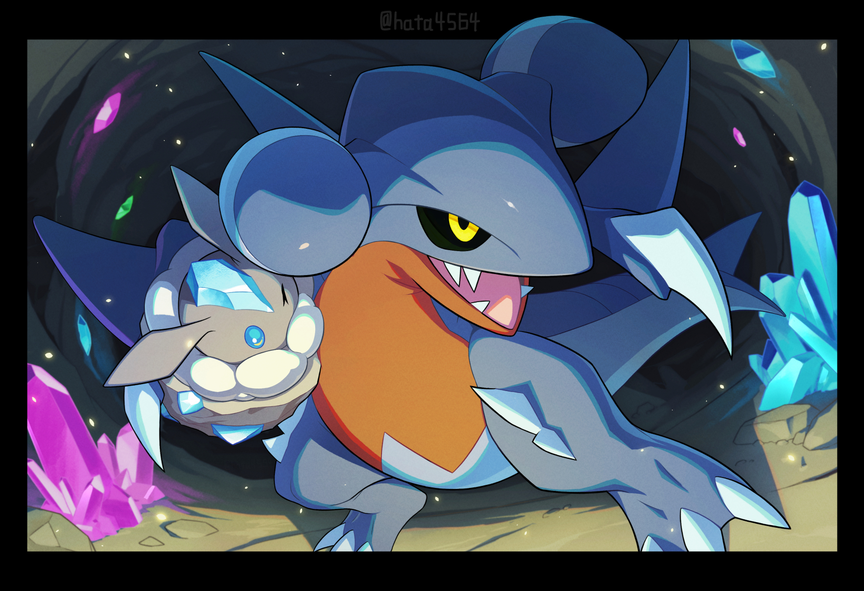 black_sclera carbink claws colored_sclera crystal gabite gen_4_pokemon gen_6_pokemon hata4564 highres nintendo no_humans open_mouth pokemon pokemon_(creature) sharp_teeth spikes standing teeth tongue yellow_eyes