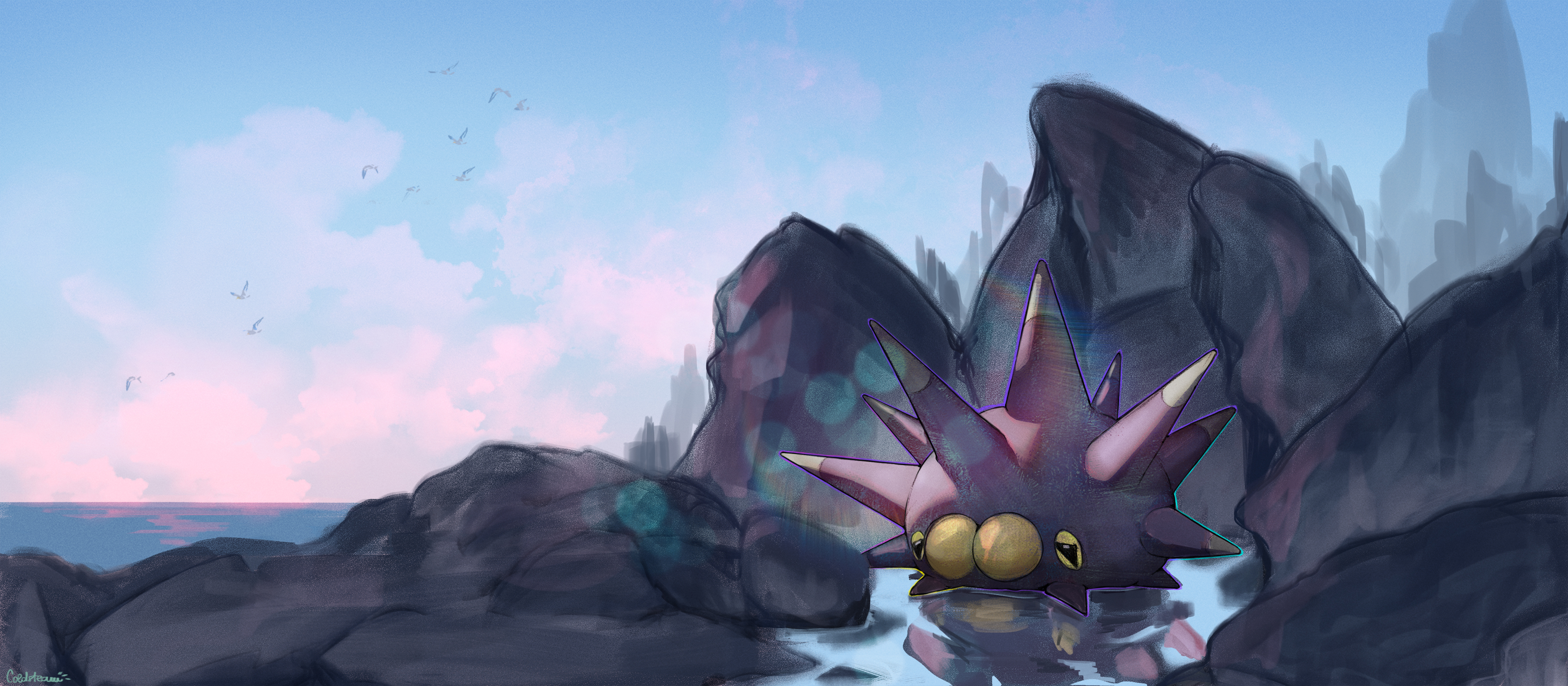 absurdres bird black_eyes cloud coldsteam commentary_request day gen_8_pokemon highres nintendo no_humans outdoors photoshop_(medium) pincurchin pokemon pokemon_(creature) puddle rock sky water