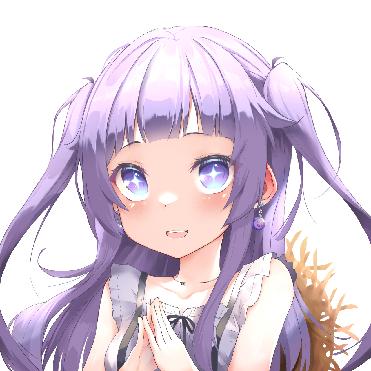 1girl bare_shoulders blunt_bangs blush cosplay earrings highres jewelry lumiel_(p&d) n4rai necklace parted_lips portrait purple_hair puzzle_&_dragons shirt sleeveless sleeveless_shirt smile solo star-shaped_pupils star_(symbol) steepled_fingers suspenders symbol-shaped_pupils teeth two_side_up upper_teeth_only white_shirt