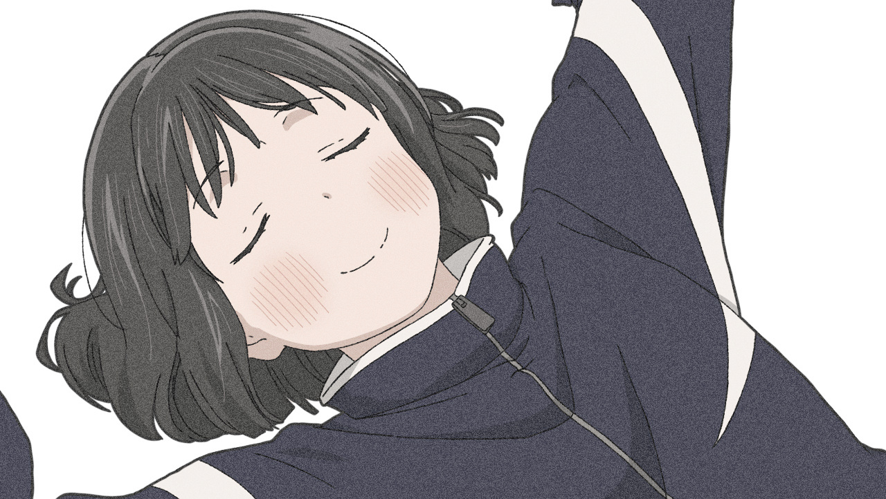 1girl black_hair blush closed_eyes koguma_(super_cub) lying on_back short_hair smile solo super_cub watanabegenn white_background