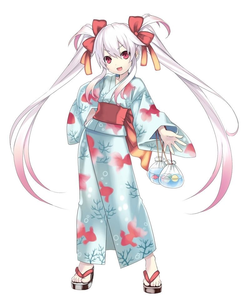 1girl :d albino alternate_costume bag blue_kimono bow child cross_edge eruma feet female_focus fish flat_chest full_body goldfish gradient_hair hair_bow hand_on_own_hip hip_focus japanese_clothes kimono long_hair multicolored_hair obi official_art open_mouth pink_eyes pink_hair sandals sash simple_background smile solo standing tsunako twintails very_long_hair white_background white_hair yukata