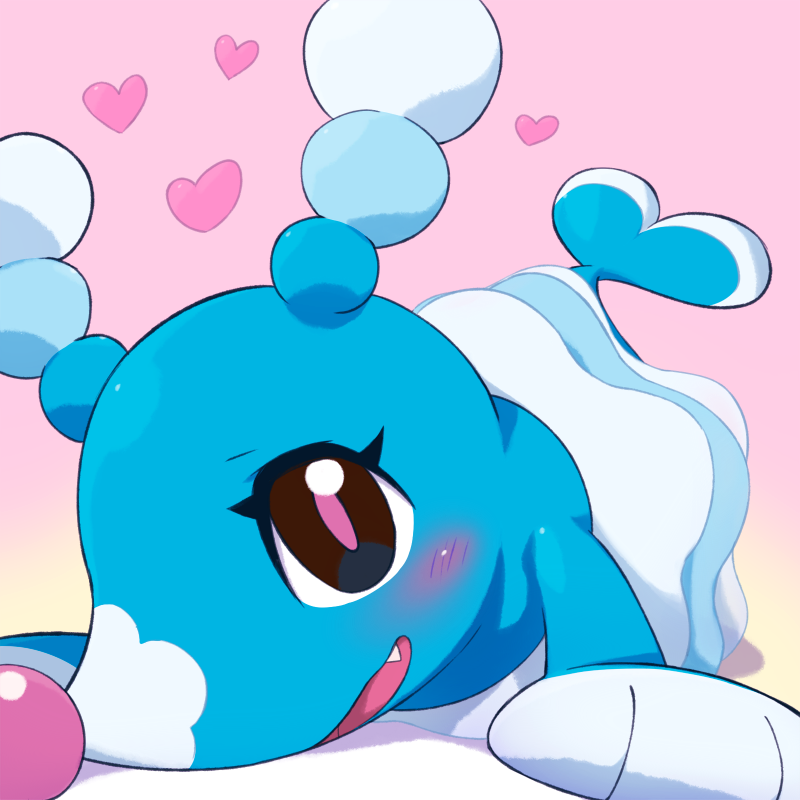 blush brionne brown_eyes eyelashes fang gen_7_pokemon heart lying mizuki_kotora nintendo no_humans on_stomach open_mouth pink_pupils pokemon pokemon_(creature) smile solo tongue