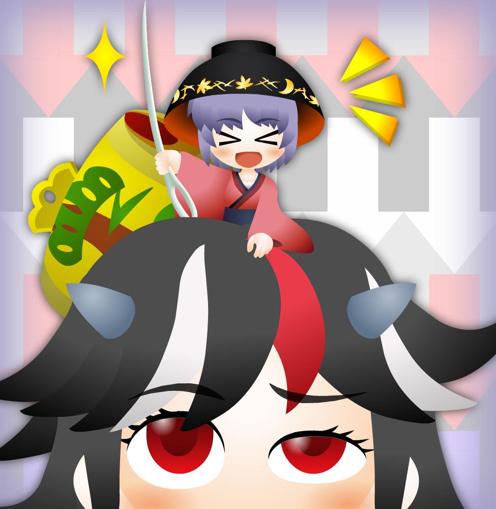 :d cocked_eyebrow confused happy horns kijin_seija kouki_ht mallet miracle_mallet needle open_mouth red_eyes sitting sitting_on_person smile sukuna_shinmyoumaru touhou xd