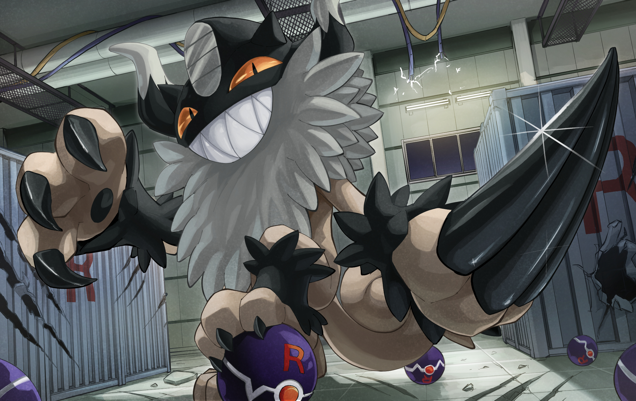 cable claw_mark claws commentary_request electricity gen_8_pokemon glint grin hakuginnosora highres indoors light nintendo no_humans nontraditional_poke_ball perrserker poke_ball pokemon pokemon_(creature) sharp_teeth shipping_container smile solo standing teeth window