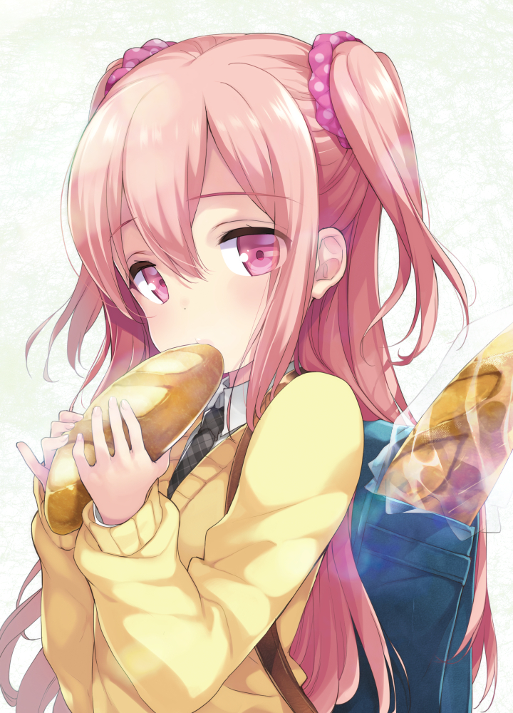 1girl backpack bag bread emily_(pure_dream) food hair_between_eyes long_hair looking_at_viewer necktie original pan_de_peace! pink_eyes pink_hair solo sweater two_side_up upper_body