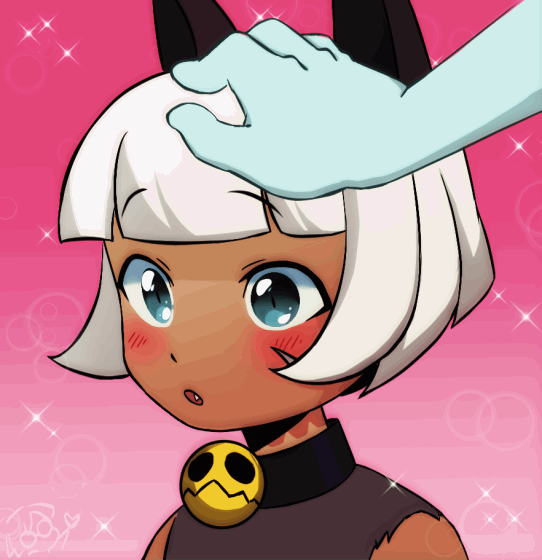 1girl 1other animated animated_gif blush bob_cut cat_girl disembodied_hand fang firemauer headpat ms._fortune_(skullgirls) neck_bell open_mouth pink_background portrait scar short_hair skullgirls sparkling_eyes upper_body white_hair wide-eyed