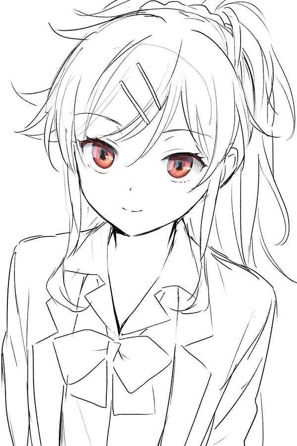 1girl bow bowtie chigusa_asuha closed_mouth dot_nose eye_focus eye_reflection greyscale hair_ornament hairclip jacket looking_at_viewer monochrome open_clothes open_jacket partially_colored ponytail qualidea_code red_eyes reflection school_uniform sekiya_asami simple_background smile solo spot_color white_background