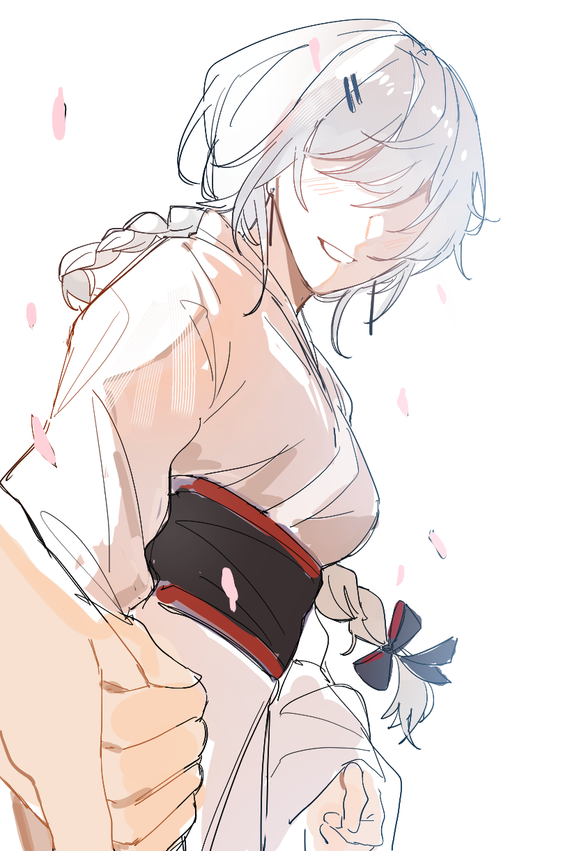 2girls 3o_c :d braid braided_ponytail crossover genshin_impact hair_between_eyes hair_ornament hairpin highres holding_hands honkai_(series) honkai_impact_3rd japanese_clothes kallen_kaslana kimono long_hair looking_at_viewer mihoyo multiple_girls open_mouth petals shaded_face simple_background smile teeth white_background white_hair white_kimono yae_miko