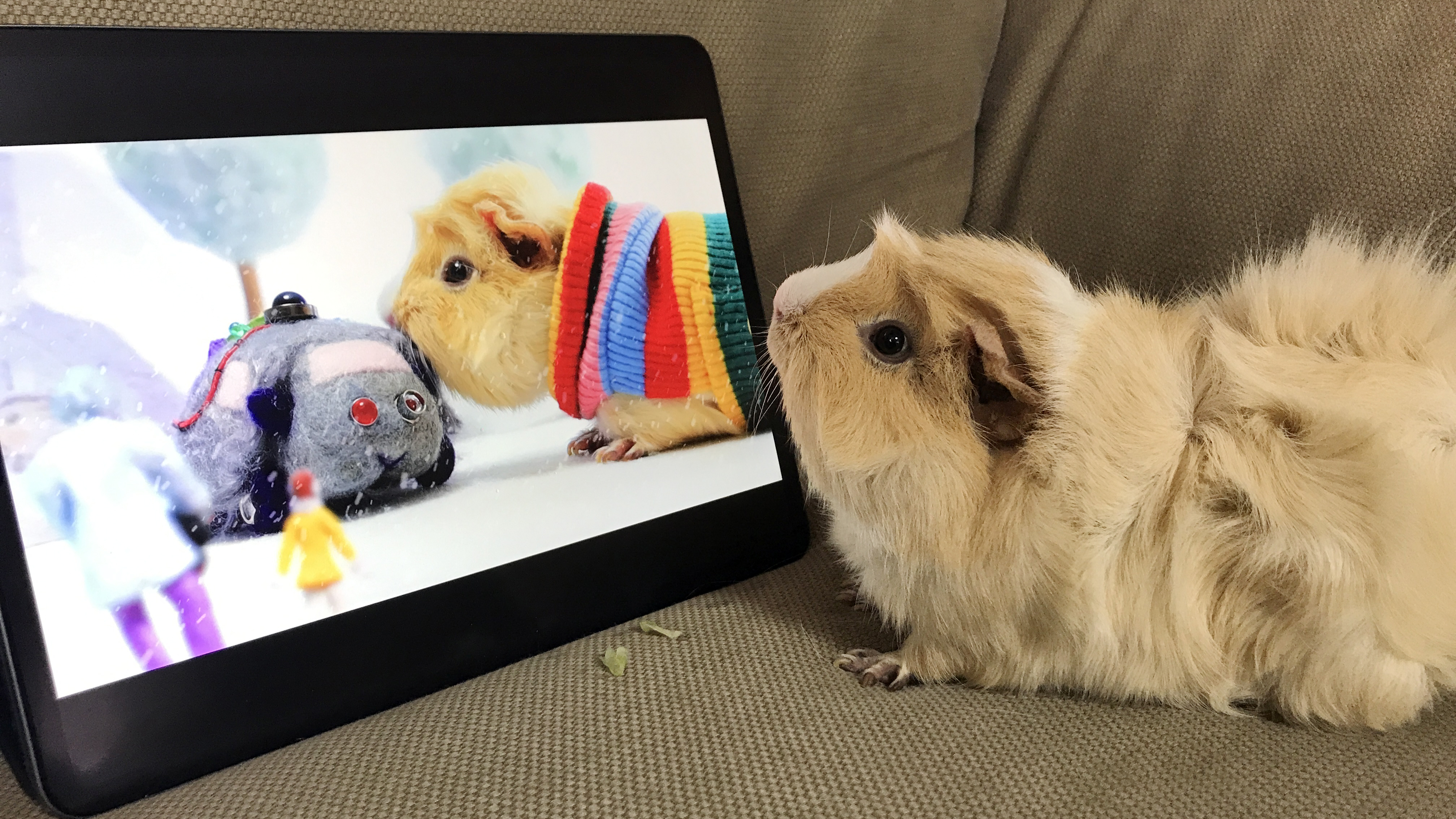 1other absurdres animal animal_focus commentary couch from_side guinea_pig highres ipad meta misato_tomoki_(mitotoki) molcar no_humans official_art on_couch photo_(medium) profile pui_pui_molcar tablet_pc time_molcar tsumugi_(pui_pui_molcar) watching whiskers