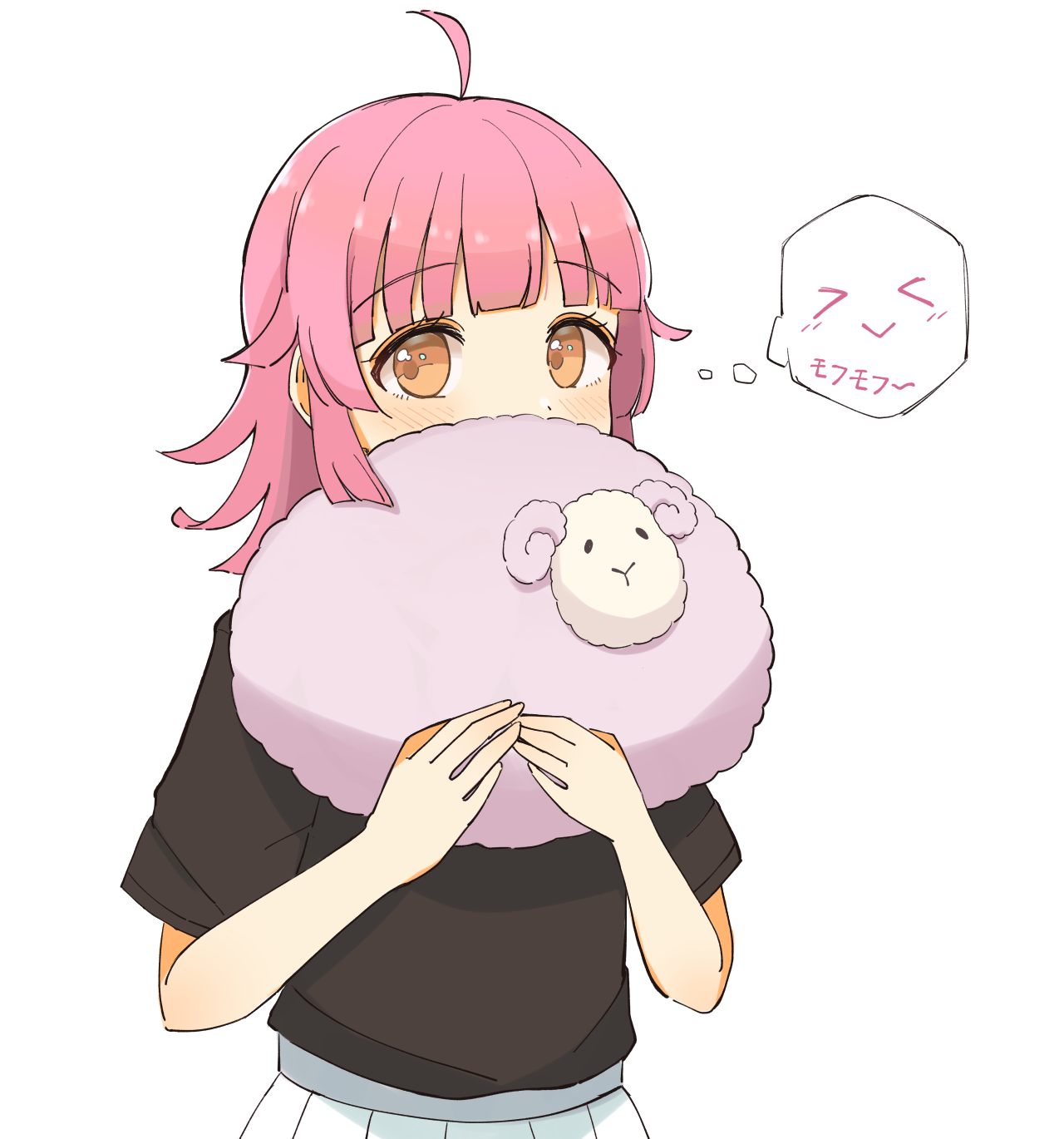 >_< 1girl ahoge black_shirt blunt_bangs blunt_ends blush commentary_request highres hugging_object looking_at_viewer love_live! love_live!_nijigasaki_high_school_idol_club pink_hair practice_student shirt shirt_tucked_in short_sleeves simple_background skirt solo speech_bubble stuffed_animal stuffed_sheep stuffed_toy tennoji_rina thought_bubble translated white_background white_skirt yellow_eyes