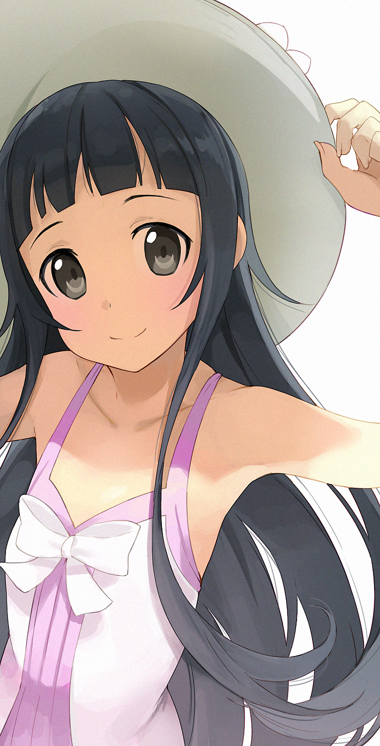 1girl black_eyes black_hair blunt_bangs closed_mouth collarbone dress flat_chest hat highres hiroki_(yyqw7151) long_hair looking_at_viewer simple_background sleeveless sleeveless_dress solo sword_art_online white_background white_dress white_hat yui_(sao)