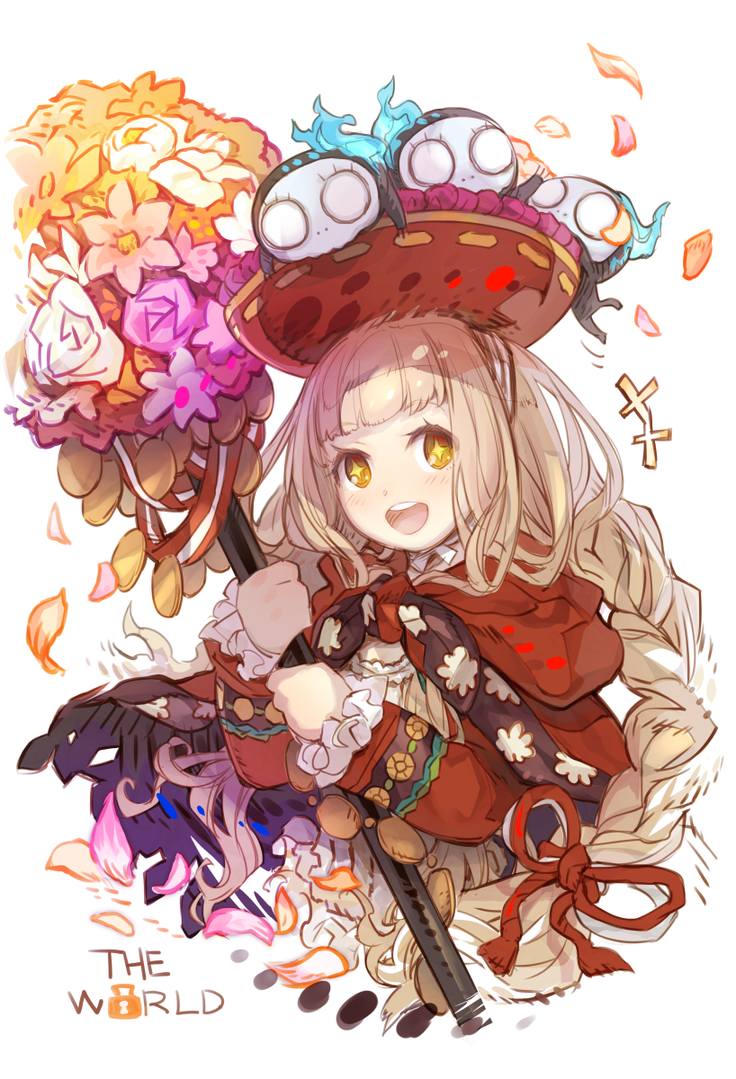 +++ +_+ 1girl :d blush braid brown_eyes brown_hair capelet commentary_request flower haku_(sabosoda) hat highres holding jacket lock long_hair long_sleeves looking_at_viewer open_mouth padlock petals pink_flower pink_rose red_capelet red_hat red_jacket red_riding_hood_(sinoalice) rose simple_background sinoalice smile solo teeth upper_body upper_teeth_only very_long_hair white_background white_flower yellow_flower