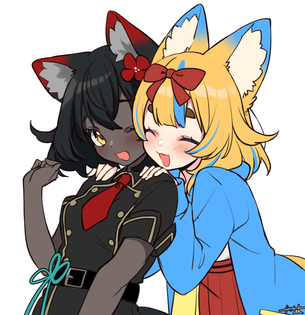 2girls :d ;d animal_ear_fluff animal_ears aqua_hair aqua_ribbon belt black_belt black_footwear black_hair black_legwear black_tail blonde_hair blue_hoodie blush buttons closed_eyes cowboy_shot dark-skinned_female dark_skin double-breasted drawstring eye_contact flower hair_between_eyes hair_flower hair_ornament hair_ribbon hakama hakama_skirt hand_up hands_on_another's_shoulders hands_up hood hood_down hoodie indie_virtual_youtuber japanese_clothes katana light_blush long_sleeves looking_at_another medium_hair military military_uniform multicolored_hair multicolored_tail multiple_girls multiple_tails necktie one_eye_closed open_clothes open_hoodie open_mouth pantyhose red_flower red_hakama red_neckwear red_ribbon red_tail ribbon sakura_chiyo_(konachi000) sakuraba_chiyo scabbard sheath sheathed short_hair short_sleeves signature simple_background skirt smile standing streaked_hair sword tail tassel thick_eyebrows thighhighs two-tone_hair two_tails very_dark_skin virtual_youtuber weapon white_background wing_collar yamano_kayo yellow_eyes