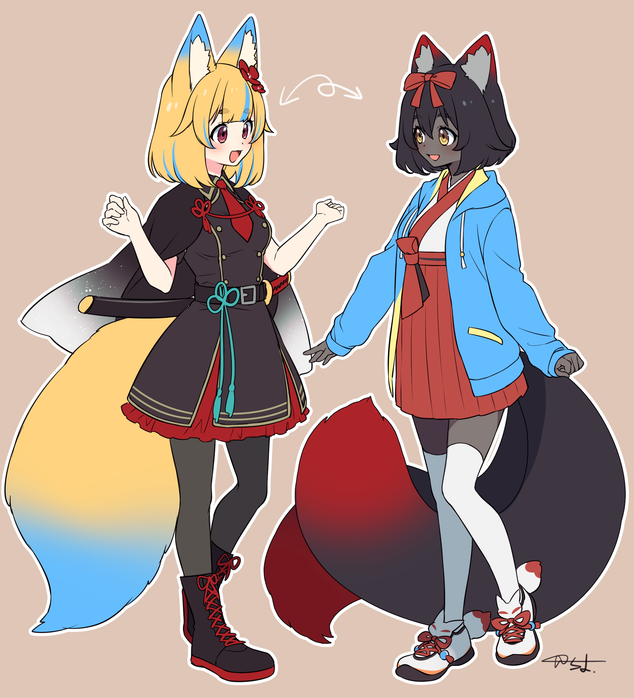2girls :d absurdres animal_ear_fluff animal_ears aqua_hair aqua_ribbon arrow_(symbol) belt black_belt black_capelet black_footwear black_hair black_legwear black_tail blonde_hair blue_hoodie boots brown_background buttons capelet cosplay costume_switch dark-skinned_female dark_skin double-breasted drawstring eye_contact flower full_body hair_between_eyes hair_flower hair_ornament hair_ribbon hakama hakama_skirt hands_up highres hood hood_down hoodie indie_virtual_youtuber japanese_clothes katana light_blush long_sleeves looking_at_another medium_hair military military_uniform multicolored_hair multicolored_tail multiple_girls multiple_tails necktie open_clothes open_hoodie open_mouth outline pantyhose red_eyes red_flower red_hakama red_neckwear red_ribbon red_skirt red_tail ribbon sakura_chiyo_(konachi000) sakuraba_chiyo scabbard sheath sheathed shoes short_hair short_sleeves signature simple_background skirt sleeves_past_wrists smile sneakers standing streaked_hair sword tail tassel thighhighs two_tails very_dark_skin virtual_youtuber weapon white_footwear white_legwear white_outline wing_collar yamano_kayo yellow_eyes