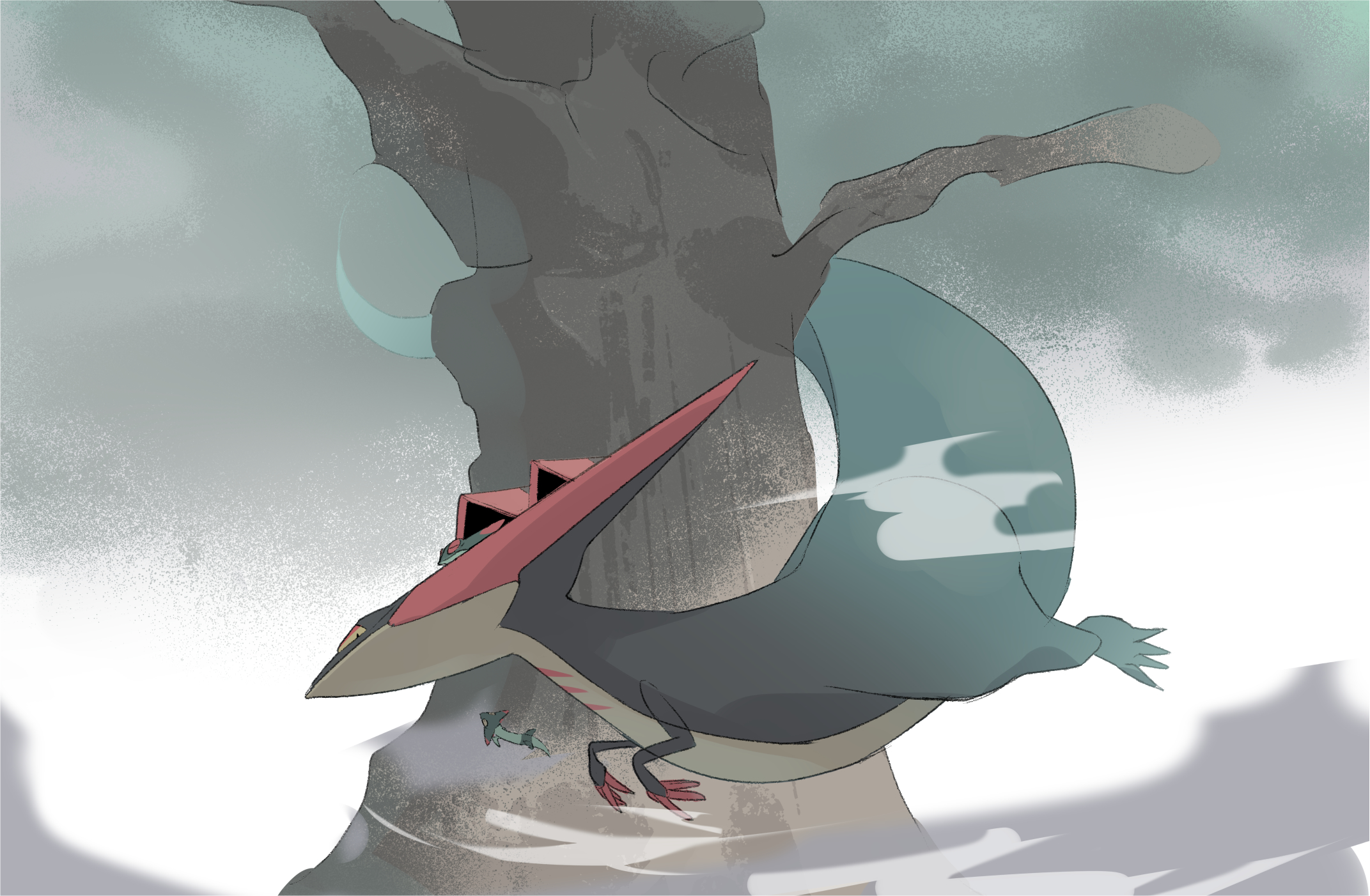 bare_tree claws closed_eyes closed_mouth commentary_request dragapult dreepy fog from_side gen_8_pokemon highres kii_(kiiui) nintendo no_humans outdoors pokemon pokemon_(creature) sideways_glance tree