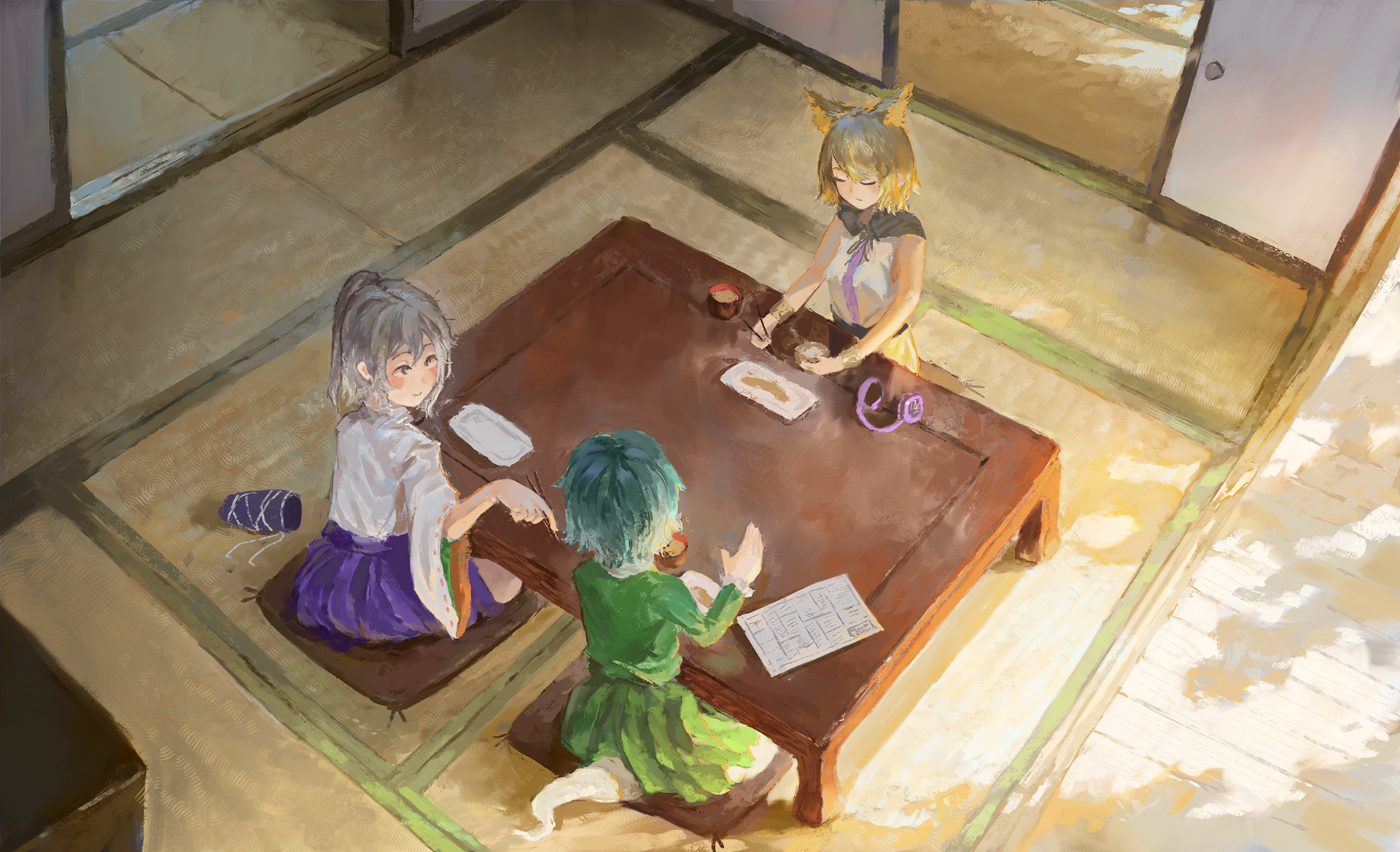 3girls blush bowl butterfly_sitting chopsticks closed_eyes cushion day dress earmuffs earmuffs_removed fjsmu from_above fusuma ghost_tail green_dress green_hair hat highres holding holding_bowl holding_chopsticks indoors japanese_clothes kariginu light_brown_hair long_sleeves looking_at_another mononobe_no_futo multiple_girls open_door paper plate ponytail short_hair shouji silver_hair sitting sleeveless sleeveless_dress slice_of_life sliding_doors smile soga_no_tojiko table tatami tate_eboshi touhou toyosatomimi_no_miko unworn_headwear veranda wide_sleeves zabuton