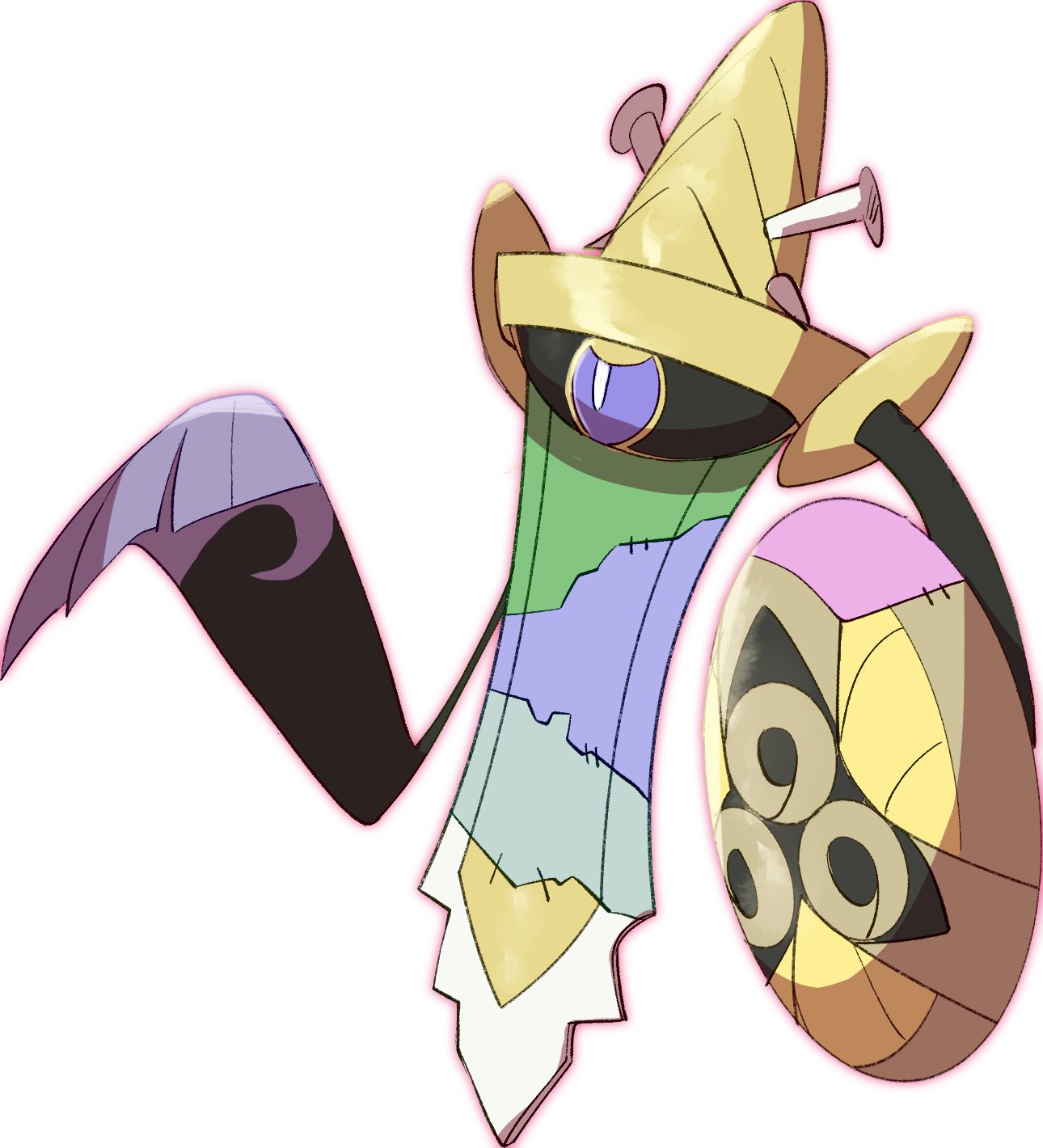 aegislash bright_pupils commentary_request gen_6_pokemon halloween highres morio_(poke_orio) nail_(hardware) nintendo no_humans pokemon pokemon_(creature) purple_eyes shield simple_background single_eye solo stitches sword weapon white_background white_pupils
