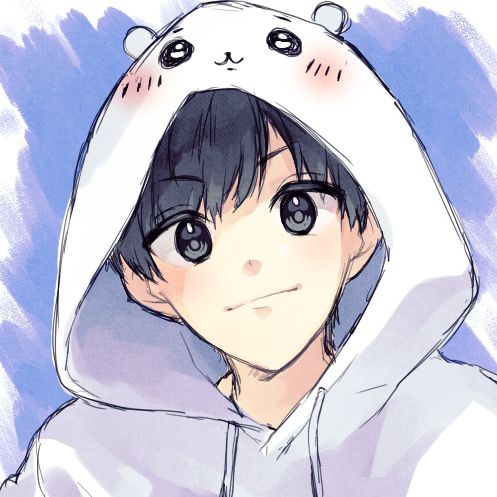 1boy animal_ear_headwear animal_hood bad_id bad_pixiv_id black_eyes blue_background commentary_request doodle drawstring fake_animal_ears head_tilt hood hood_up hoodie looking_at_viewer male_focus original portrait short_hair smile solo white_background white_hoodie ystn0046