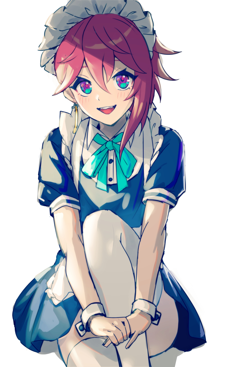 1girl alternate_costume apron aqua_ribbon asymmetrical_hair blue_dress blush buttons dress earrings enmaided fangs female_focus flat_chest frilled_apron frills happy indie_virtual_youtuber jewelry knee_up light_blush looking_at_viewer maid maid_apron maid_headdress neck_ribbon okrihto_tirto open_mouth own_hands_together pink_eyes puffy_short_sleeves puffy_sleeves red_hair ribbon short_hair short_sleeves simple_background single_earring sitting smile solo thighhighs v_arms virtual_youtuber white_apron white_background white_thighhighs wrist_cuffs yoruhachi