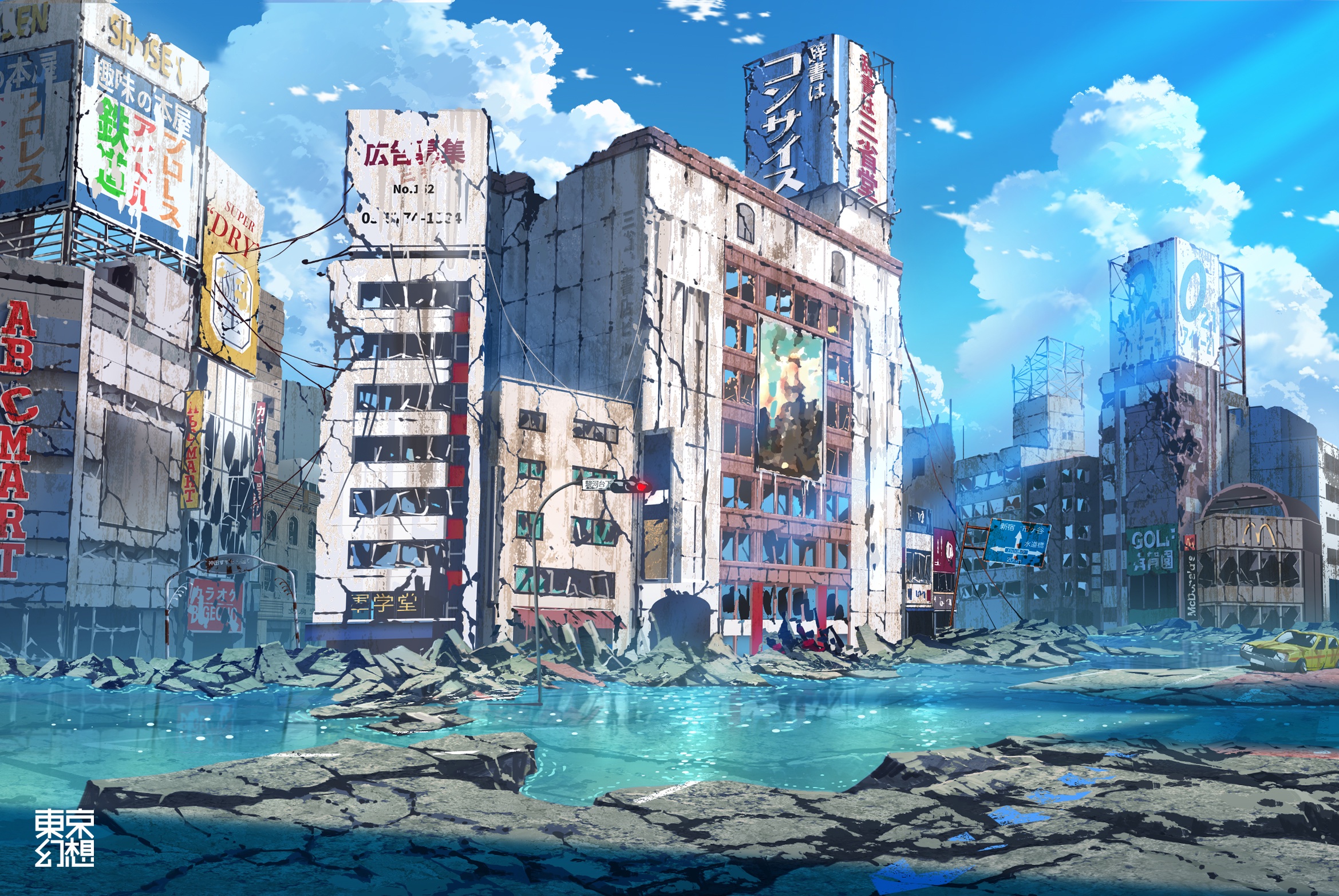 abandoned blue_sky broken_window building car cloud cloudy_sky day highres mcdonald's motor_vehicle no_humans original outdoors ruins scenery sign sky tokyogenso traffic_light water