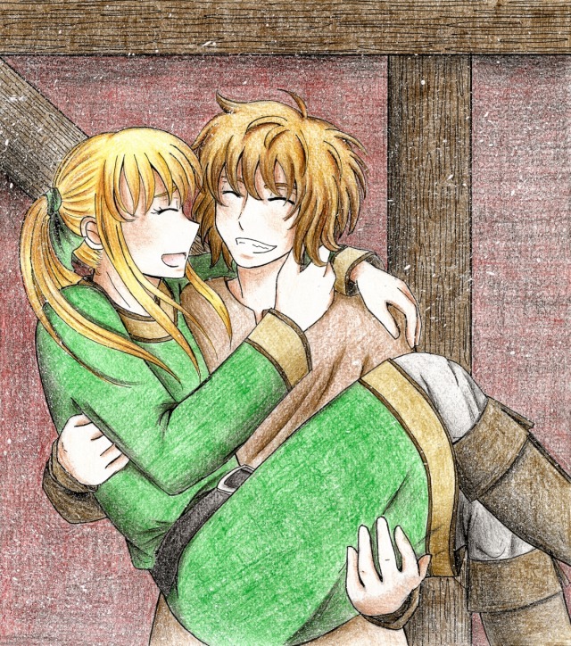 2boys arms_around_neck belt black_belt blonde_hair boots canute carrying closed_eyes darkrainbowtear eyelashes green_tunic happy leather leather_boots long_hair male_focus messy_hair multiple_boys multiple_girls open_mouth parted_lips ponytail prince profile smile teeth thorfinn tunic viking vinland_saga