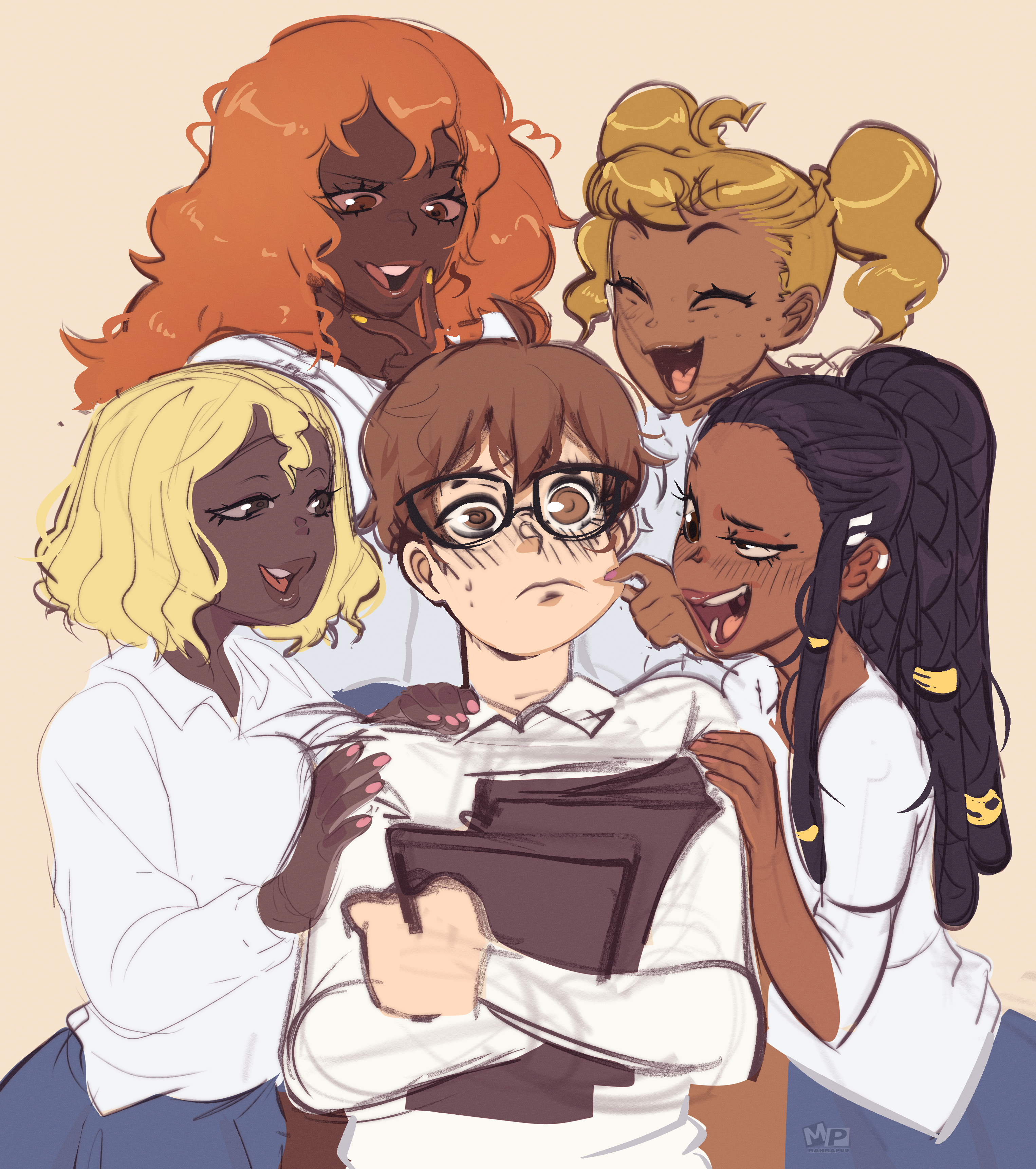 1boy 4girls absurdres alternate_skin_color alternate_universe black-framed_eyewear black_hair blonde_hair blush breast_press breasts brown_hair brown_lips bullying cheek_pinching chocotoro commentary dark-skinned_female dark_skin darkened_skin dreadlocks earclip english_commentary fang fingernails freckles gamou_maki glasses hachiouji_naoto hair_ornament hair_tubes hairclip highres huge_filesize ijiranaide_nagatoro-san licking_lips long_hair mahmapuu medium_breasts multiple_girls nagatoro_hayase nail_polish naughty_face open_mouth orange_hair pinching pink_nails platinum_blonde_hair ponytail red_lips sakura_(nagatoro) short_hair short_twintails sketch teeth tongue tongue_out twintails upper_teeth_only uvula very_dark_skin yellow_nails yoshi_(nagatoro)