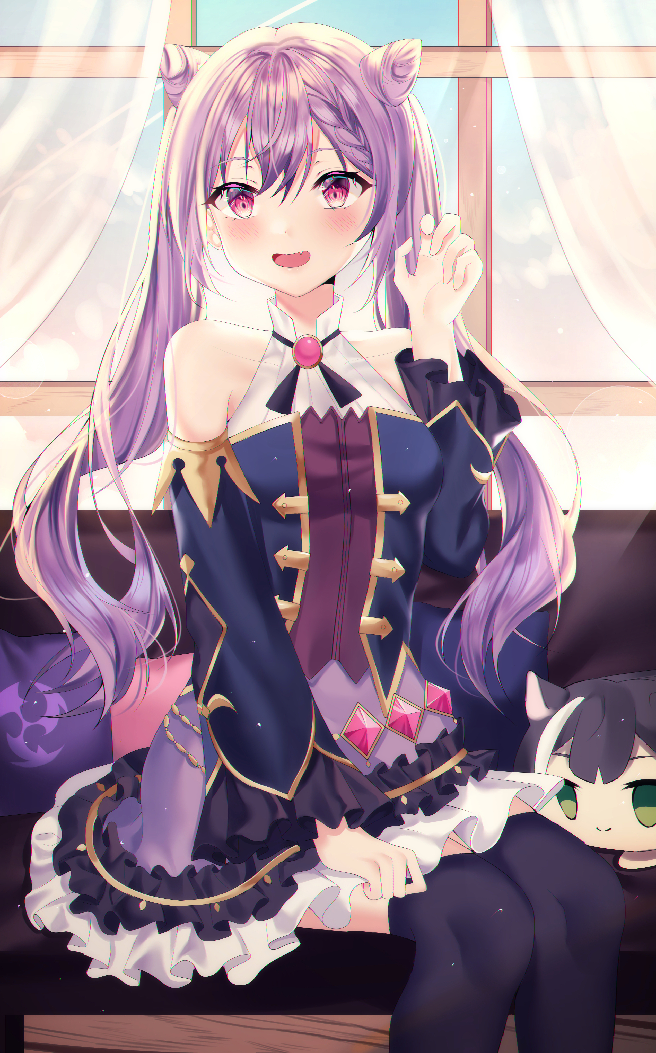 1girl :d absurdres alternate_costume black_thighhighs character_doll commentary_request cosplay couch curtains detached_sleeves doll double_bun emduck genshin_impact hair_between_eyes hair_bun highres karyl_(princess_connect!) karyl_(princess_connect!)_(cosplay) keqing_(genshin_impact) long_hair looking_at_viewer open_mouth paw_pose pillow princess_connect! purple_eyes purple_hair sidelocks sitting smile solo thighhighs twintails wide_sleeves window zettai_ryouiki