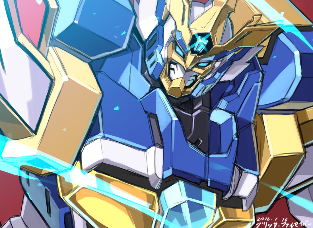 blue_eyes character_name chest_jewel dated energy forehead_jewel glitter_falsaber mecha no_humans red_background robot super_robot_wars super_robot_wars_bx tonami_kanji