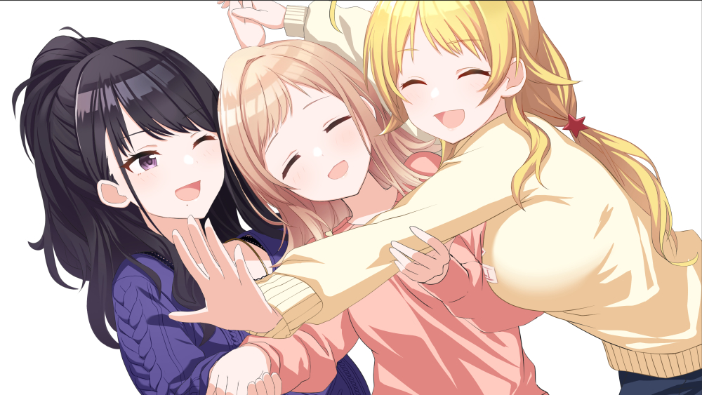 3girls ^_^ argyle_clothes argyle_sweater black_hair blonde_hair blush breasts closed_eyes hachimiya_meguru holding_hands idolmaster idolmaster_shiny_colors kazano_hiori large_breasts long_hair multiple_girls ponytail sakuragi_mano shooka simple_background smile sweater white_background