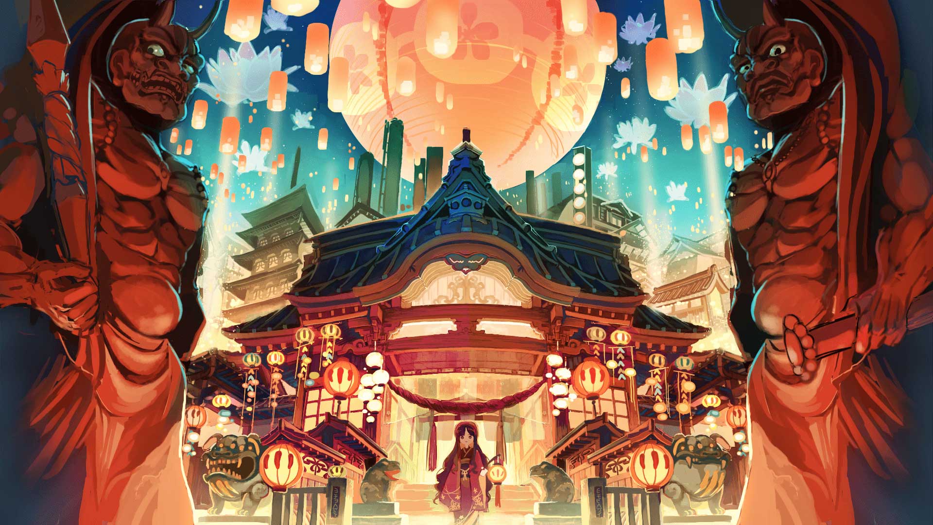 1girl 2boys architecture artist_request black_hair building east_asian_architecture flower hat highres holding japanese_clothes kimono lantern long_hair looking_at_viewer multiple_boys oni original rope shimenawa statue sword traditional_clothes very_long_hair virtual_market weapon wide_shot
