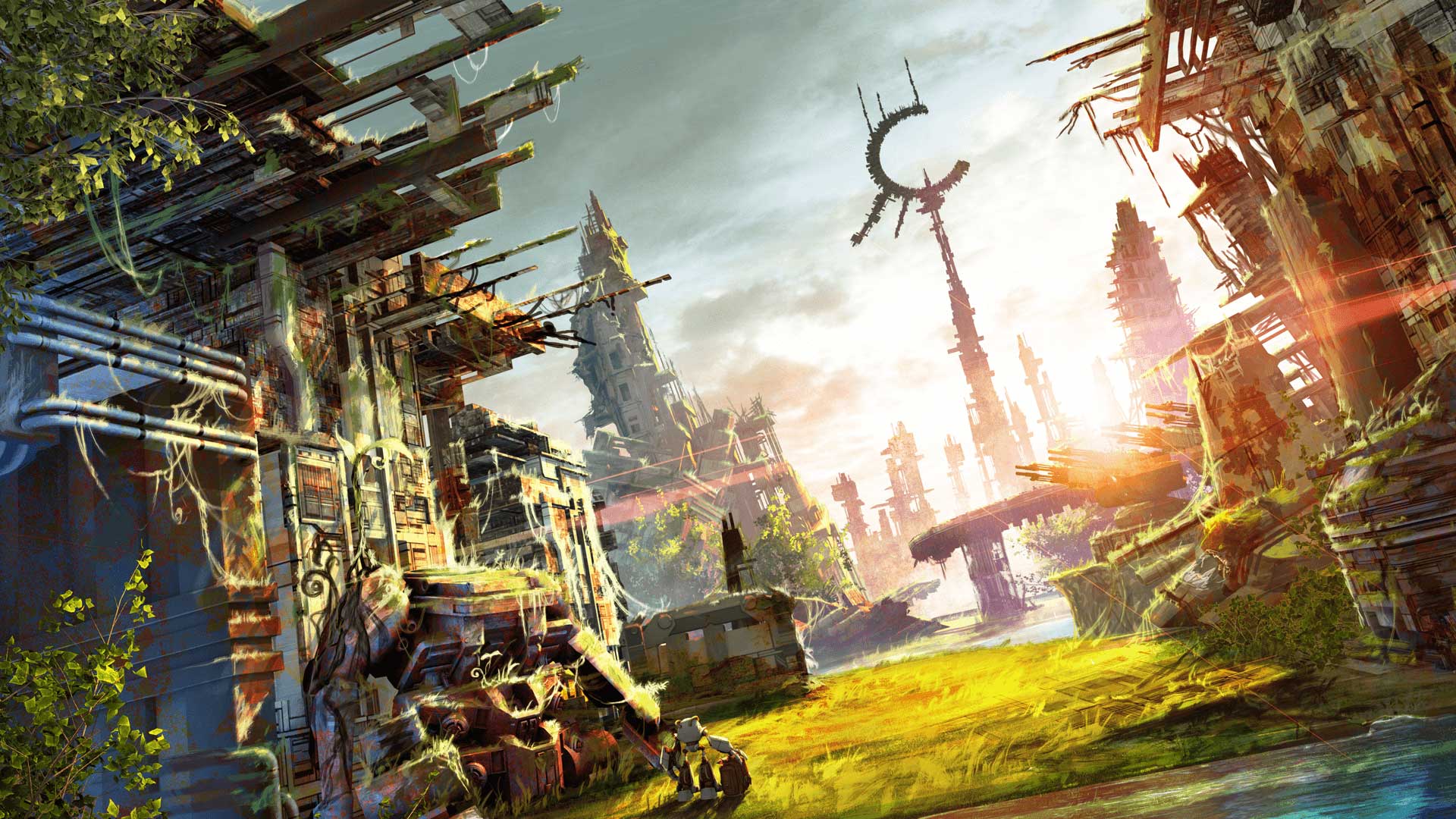 1other artist_request cloud cloudy_sky grass highres industrial industrial_pipe lens_flare metal no_humans non-humanoid_robot outdoors robot ruins rust scenery sky solo tree very_wide_shot virtual_market