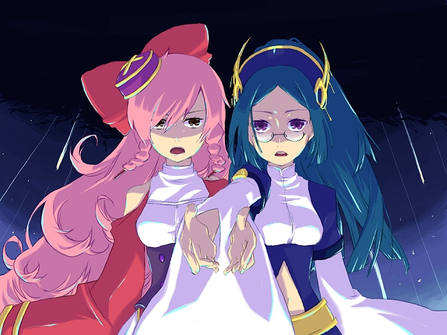 00s 2girls ar_tonelico ar_tonelico_ii blue_hair bow braid brown_eyes curly_hair dress glasses gust hair_bow hair_ornament hat infel_(ar_tonelico) long_hair multiple_girls music nenesha_(ar_tonelico) pink_hair purple_eyes singing spoilers twin_braids very_long_hair yumemitsuki