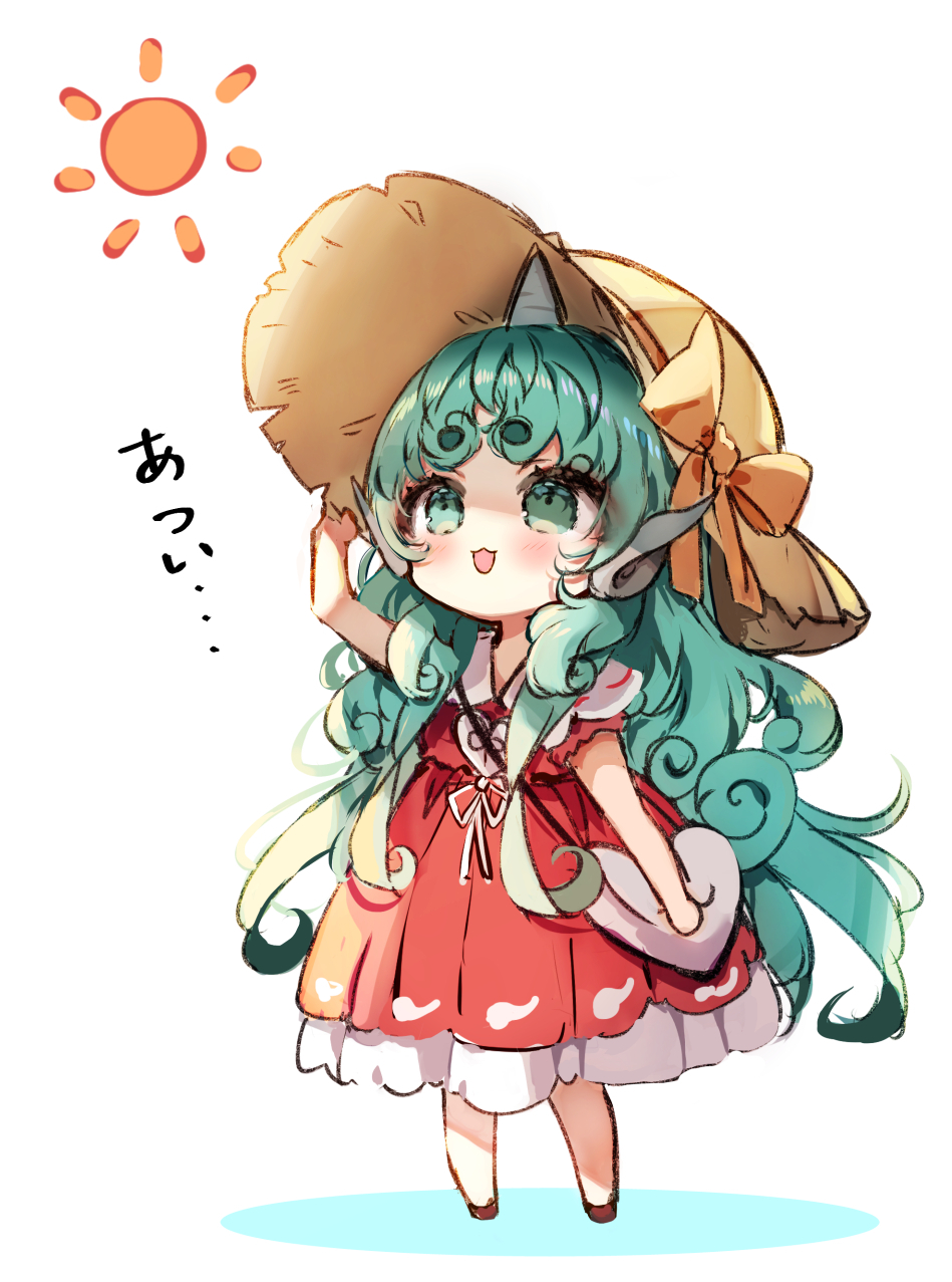 1girl aqua_hair bag bow brown_bow brown_hat brown_shoes chibi colored_shadow commentary_request dress green_eyes hand_on_headwear hat hat_bow heart-shaped_bag highres horns komano_aunn long_hair piyokichi red_dress shadow shoes short_eyebrows short_sleeves shoulder_bag single_horn solo sun_symbol thick_eyebrows touhou translation_request very_long_hair white_background