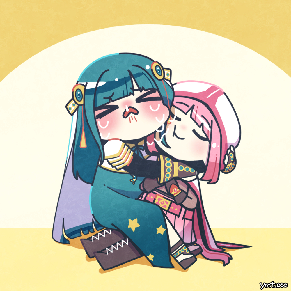 >_< 2girls armor beige_background belt blue_dress blue_hair blue_ribbon blunt_bangs blush boots brown_footwear brown_gloves cheek_press chibi cloak closed_eyes cross-laced_footwear crying dress fingerless_gloves full_body furrowed_brow gloves hairband hand_on_another's_head hand_on_another's_shoulder happy happy_tears hime_cut hood hood_up hug inui_yamato light_blush magia_record:_mahou_shoujo_madoka_magica_gaiden mahou_shoujo_madoka_magica multiple_girls nanami_yachiyo neck_ribbon no_nose nose_blush on_floor orange_background pauldrons pink_belt pink_hair pink_skirt platform_footwear pleated_skirt ribbon sandals shadow shoulder_armor sidelocks simple_background sitting sitting_on_person skirt smile snot soul_gem star_(symbol) star_print streaming_tears tamaki_iroha tassel tears twitter_username u_u veil wavy_mouth white_cloak