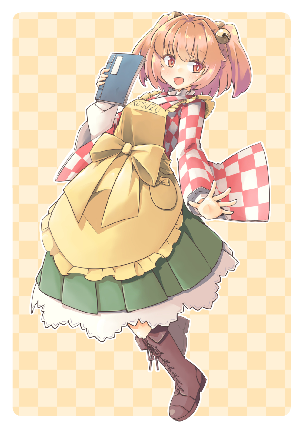 1girl apron arnest bell book boots border bow brown_boots character_name checkered_background checkered_clothes checkered_kimono clothes_writing commission frilled_apron frills green_skirt hair_bell hair_ornament highres holding holding_book japanese_clothes jingle_bell kimono lace-up_boots long_sleeves looking_at_viewer motoori_kosuzu open_mouth orange_hair outstretched_hand petticoat red_eyes red_kimono shirt short_hair sidelocks skeb_commission skirt smile solo touhou two-tone_kimono two_side_up white_border white_kimono white_shirt yellow_apron yellow_background yellow_bow
