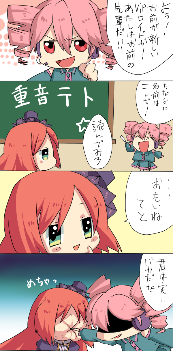 1boy 1girl 4koma :> ^_^ alternate_kanji_reading chalkboard chibi closed_eyes comic drill_hair green_eyes hat headset highres in_the_face kasane_teto kasane_teto_(utau) mini_hat mini_top_hat nagata namine_ritsu pointing poking red_eyes red_hair shaded_face sin_(hankotsu_bunny) top_hat translation_request trap triple_baka_(vocaloid) twin_drills twintails utau veil vocaloid