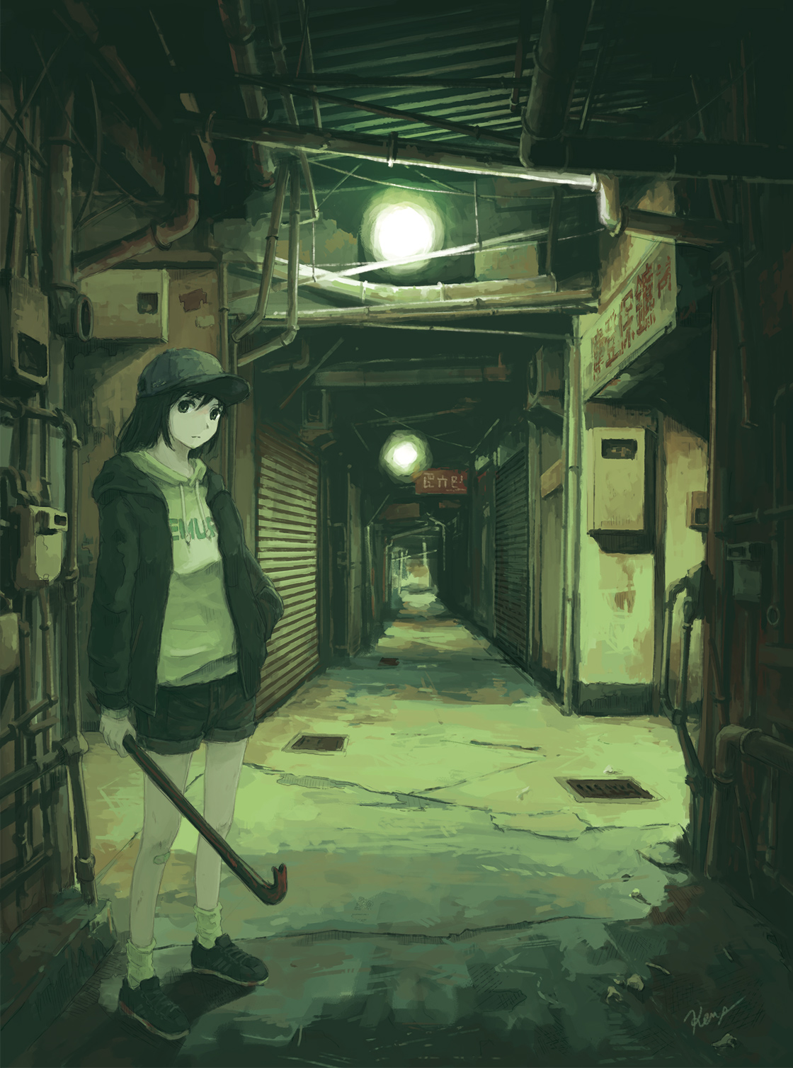 1girl alley baseball_cap black_hair commentary crowbar hand_in_pocket hat highres holding hood hoodie jacket kensight328 long_hair original industrial_pipe short_shorts shorts
