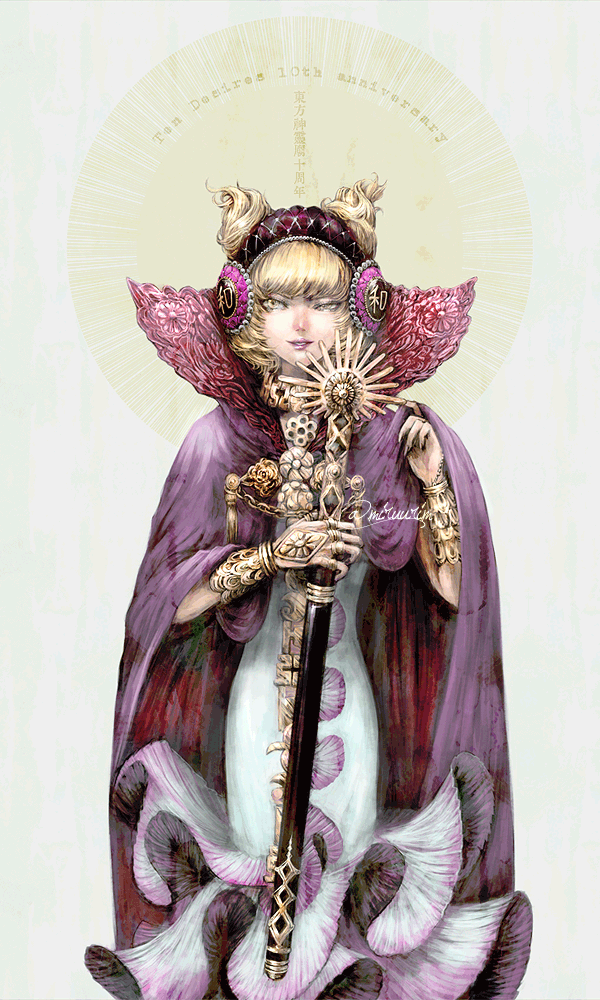 1girl blonde_hair bracelet cape commentary_request dress earmuffs embellished_costume eyebrows_hidden_by_hair feet_out_of_frame grey_background hand_up holding holding_sword holding_weapon jewelry lips looking_at_viewer nazo_(mystery) parted_lips pointy_hair purple_cape sheath sheathed short_hair simple_background smile solo standing sword ten_desires touhou toyosatomimi_no_miko uneven_eyes weapon white_dress yellow_eyes