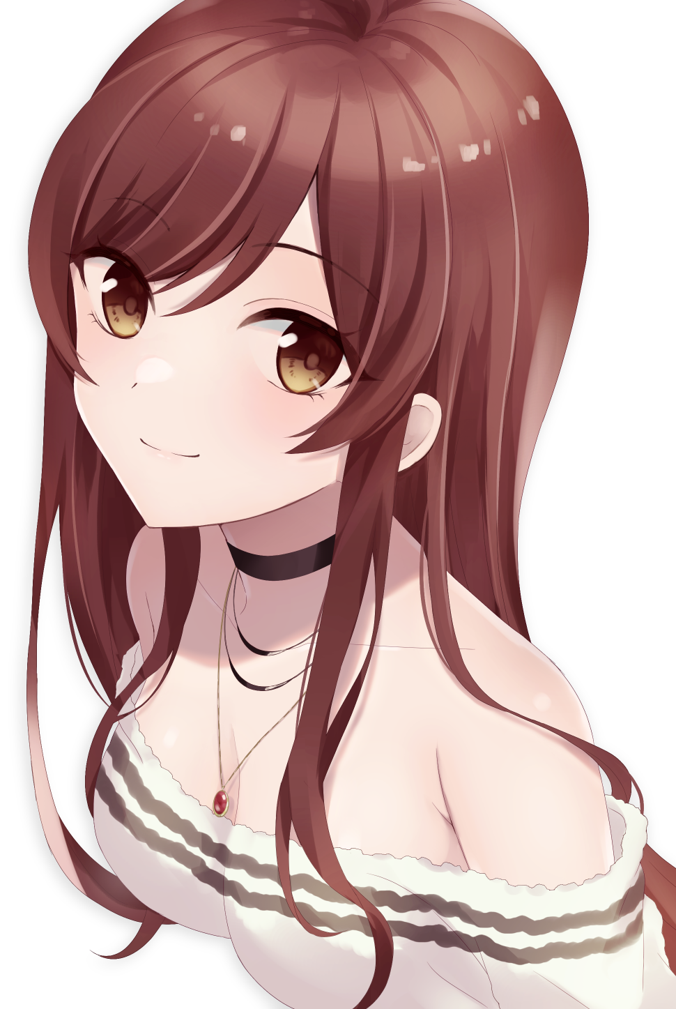 1girl armpit_crease bare_shoulders black_choker breasts choker cleavage collarbone dutch_angle highres idolmaster idolmaster_shiny_colors jewelry kumano09_(yaecha0) light_blush looking_at_viewer medium_breasts necklace off_shoulder osaki_amana red_hair simple_background smile solo upper_body white_background