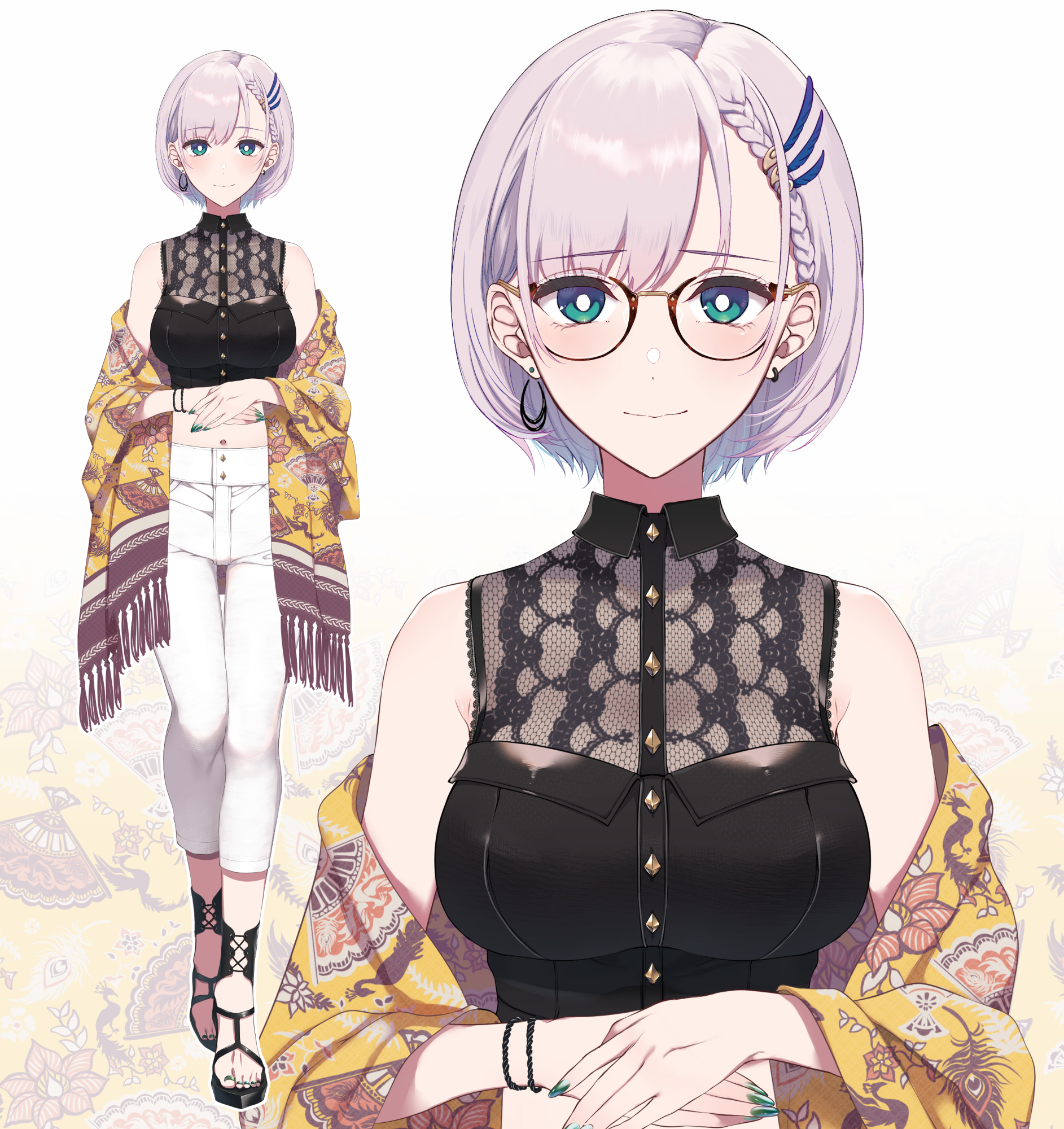 1girl alternate_costume bracelet braid braided_bangs breasts bright_pupils crop_top earrings feather_hair_ornament feathers feet female_focus glasses green_eyes hair_ornament highres hololive hololive_indonesia jewelry large_breasts looking_at_viewer mixed-language_commentary multiple_views nail_polish navel official_alternate_costume official_art own_hands_together pants pavolia_reine pavolia_reine_(indonesian_casual) pochi_(pochi-goya) sandals shawl smile toenail_polish toenails toes virtual_youtuber white_pants white_pupils yellow_shawl