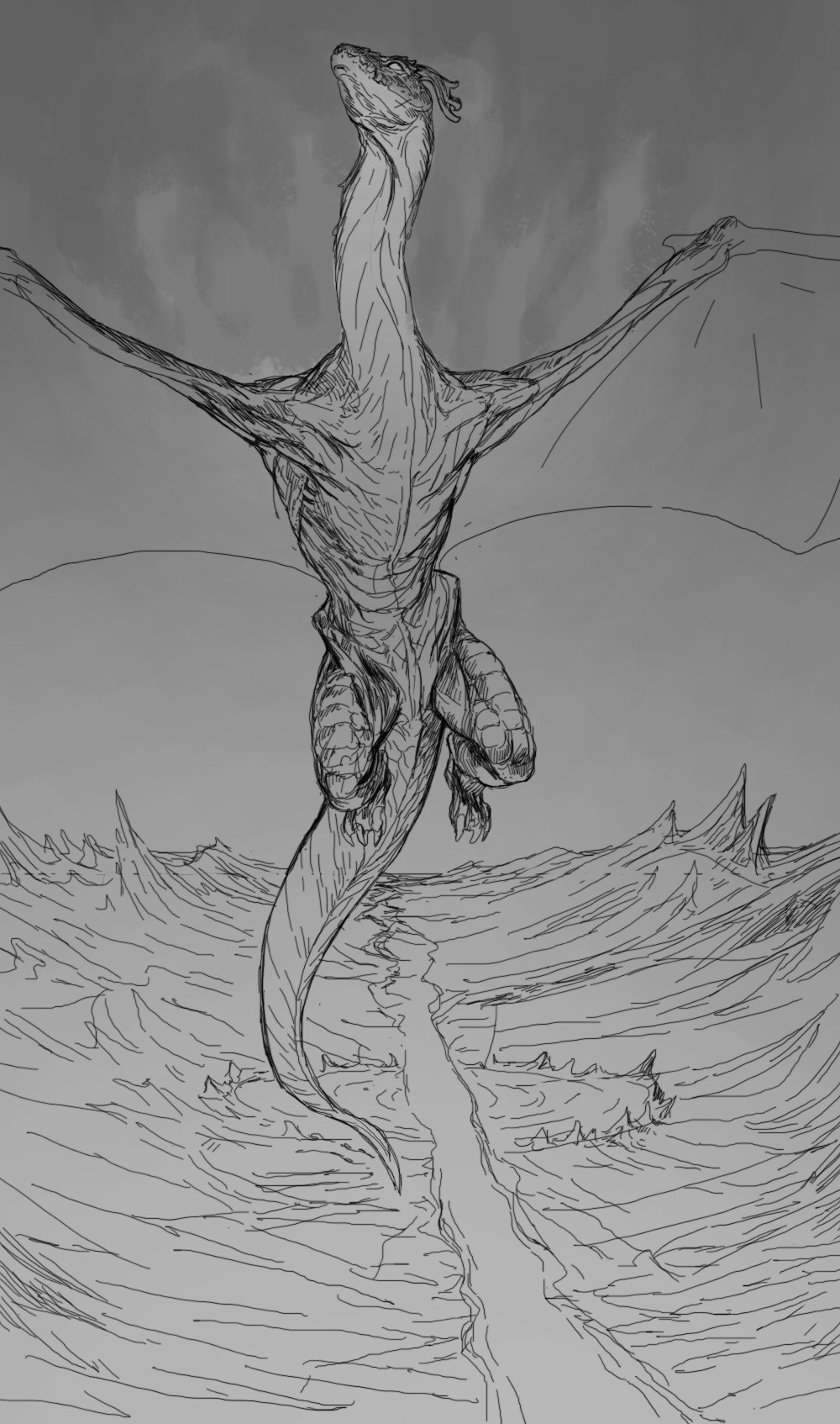 commentary dragon english_commentary flying greyscale highres monochrome no_humans original outdoors spread_wings y_naf