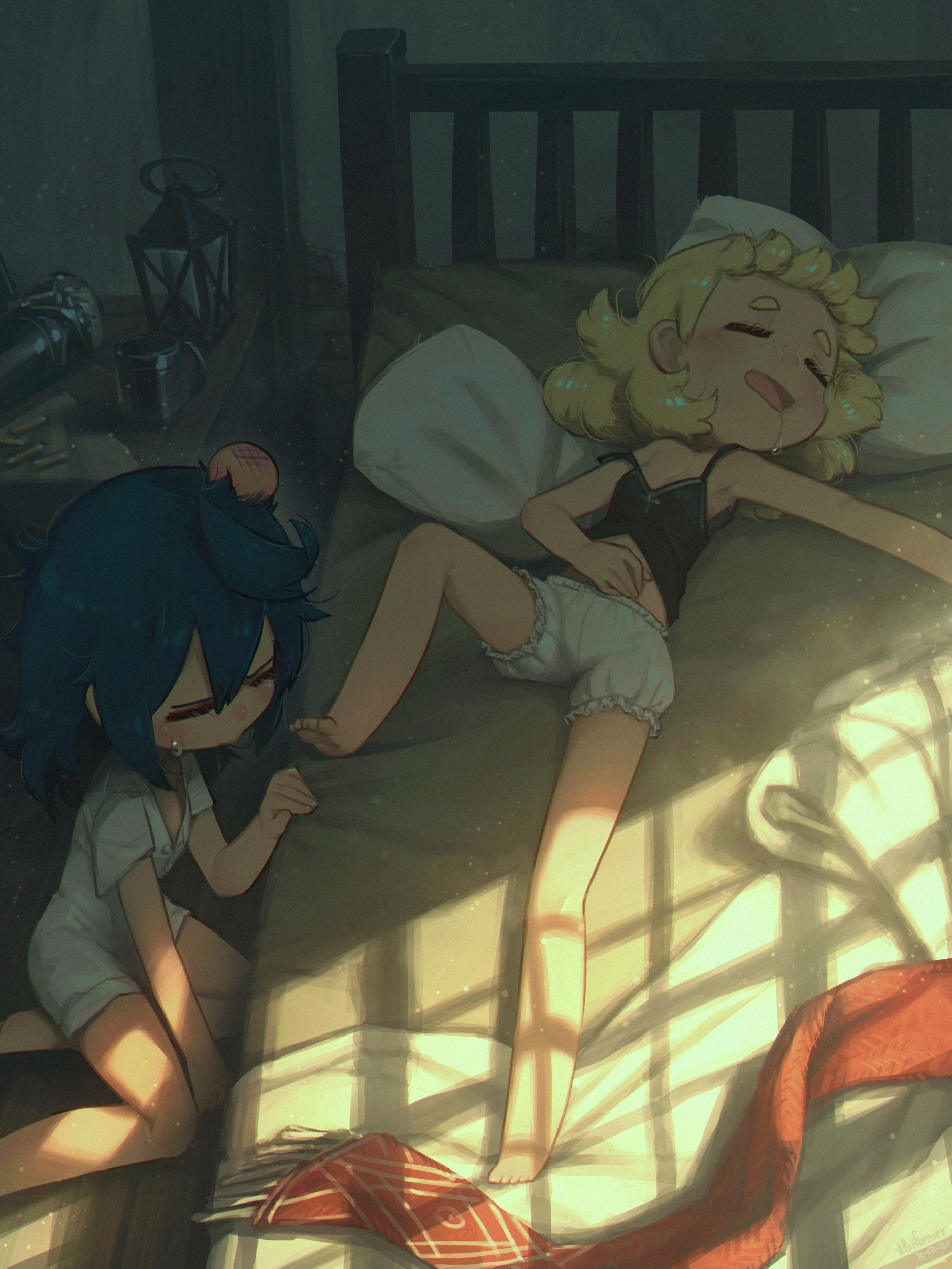 2girls absurdres black_camisole blonde_hair bloomers blue_hair camisole closed_eyes commentary cressey_(porforever) cup drooling english_commentary hand_on_own_stomach head_bump highres indoors lantern lying multiple_girls on_back on_bed open_mouth original pillow porforever short_hair short_sleeves sleeping strap_slip sweatdrop underwear underwear_only