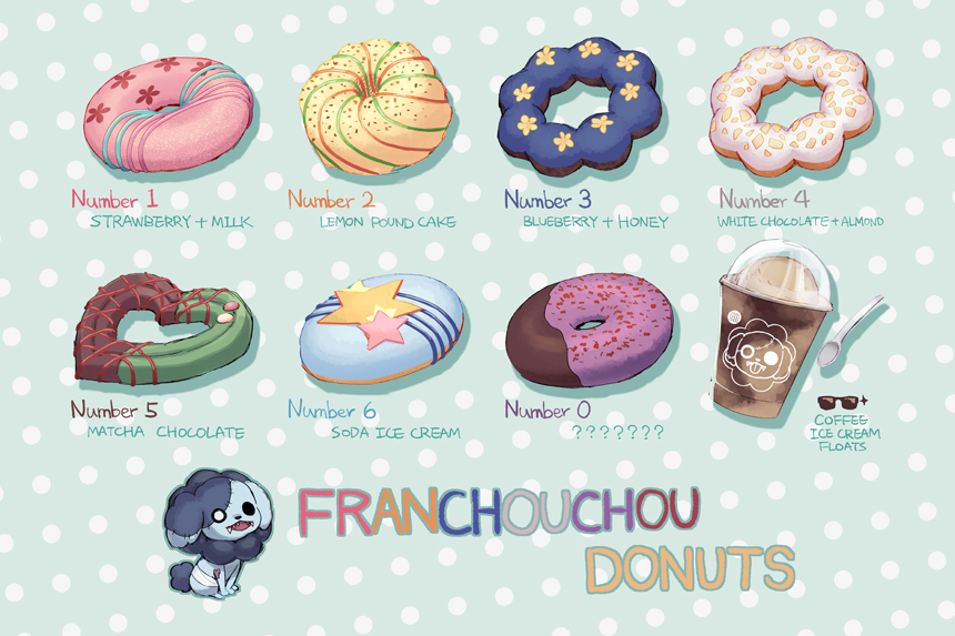 ? ?? bliss_(ferment_factory) cake chocolate coffee commentary cup dessert disposable_cup dog donut drink english_text food food_focus frappuccino heart heart-shaped_food hoshikawa_lily ice_cream ice_cream_float icing konno_junko minamoto_sakura mizuno_ai nikaidou_saki no_humans polka_dot polka_dot_background romero_(zombie_land_saga) spoon sprinkles star-shaped_food star_(symbol) untranslatable_commentary yamada_tae yuugiri_(zombie_land_saga) zombie_land_saga